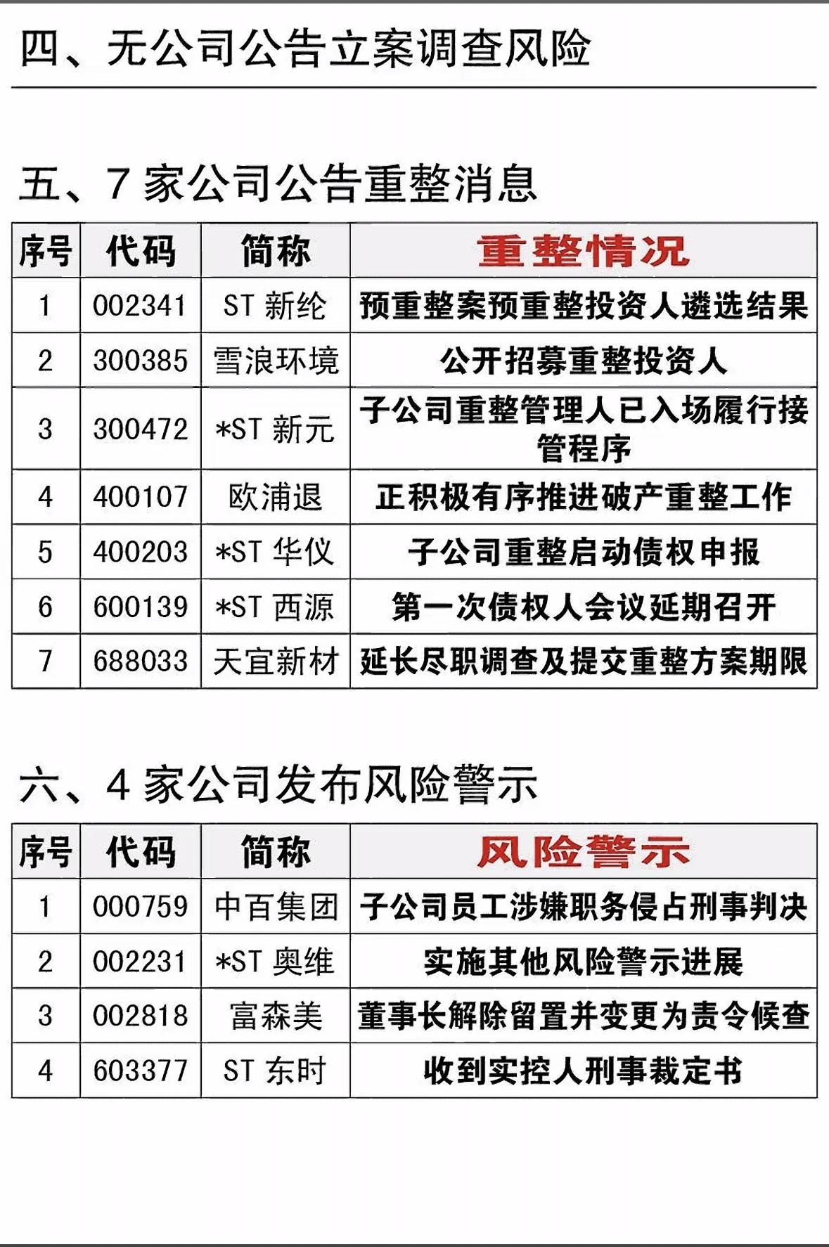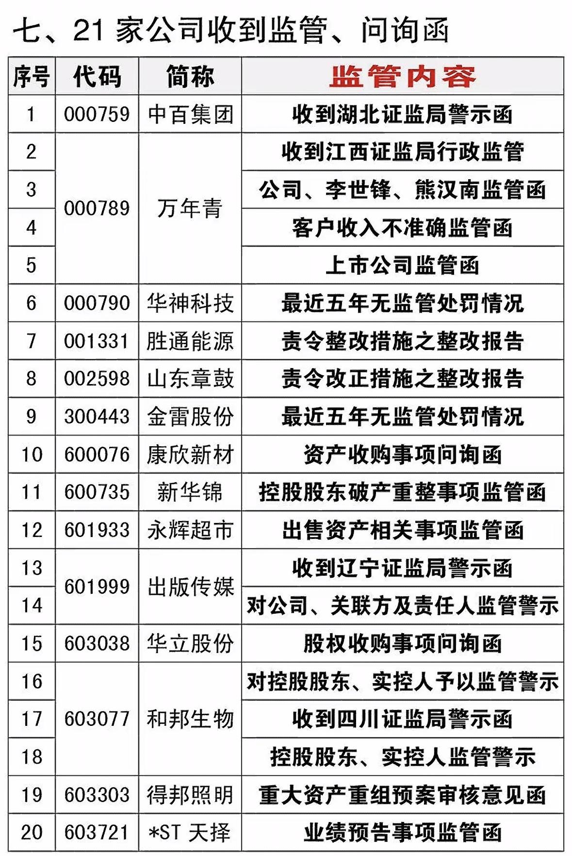 1月24日周六今日21家公司收到监管、问询函,涉及财务、股权等多方面问题 多家公司面临退市风险,部分企业申请撤销警示,市场波动需谨慎。 4家上市公司面临退市风险,3家企业或遭退市警示,1家公司申请撤销风险警示