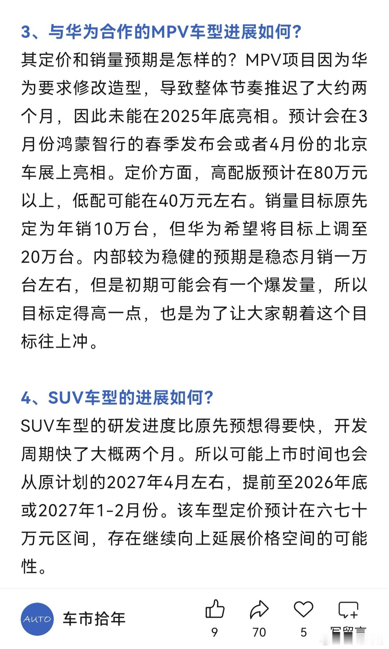 关于尊界26年及车型规划:尊界s800 1.尊界S800月销稳定在2000-2500台之间,2026年尊界销量目标是3万台;2.尊界MPV预计今年3月鸿蒙智行春季发布会或者4月份北京车展亮相预计40-80万元左右;3.尊界SUV车型进度加快预计2026年底或者2027年1、2月份,预计六七十万元。尊界汽车鸿蒙智行