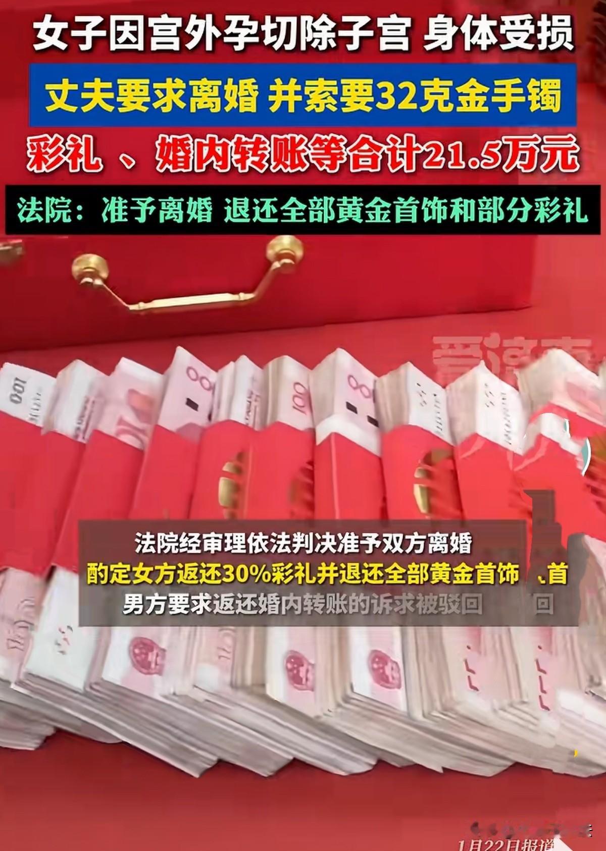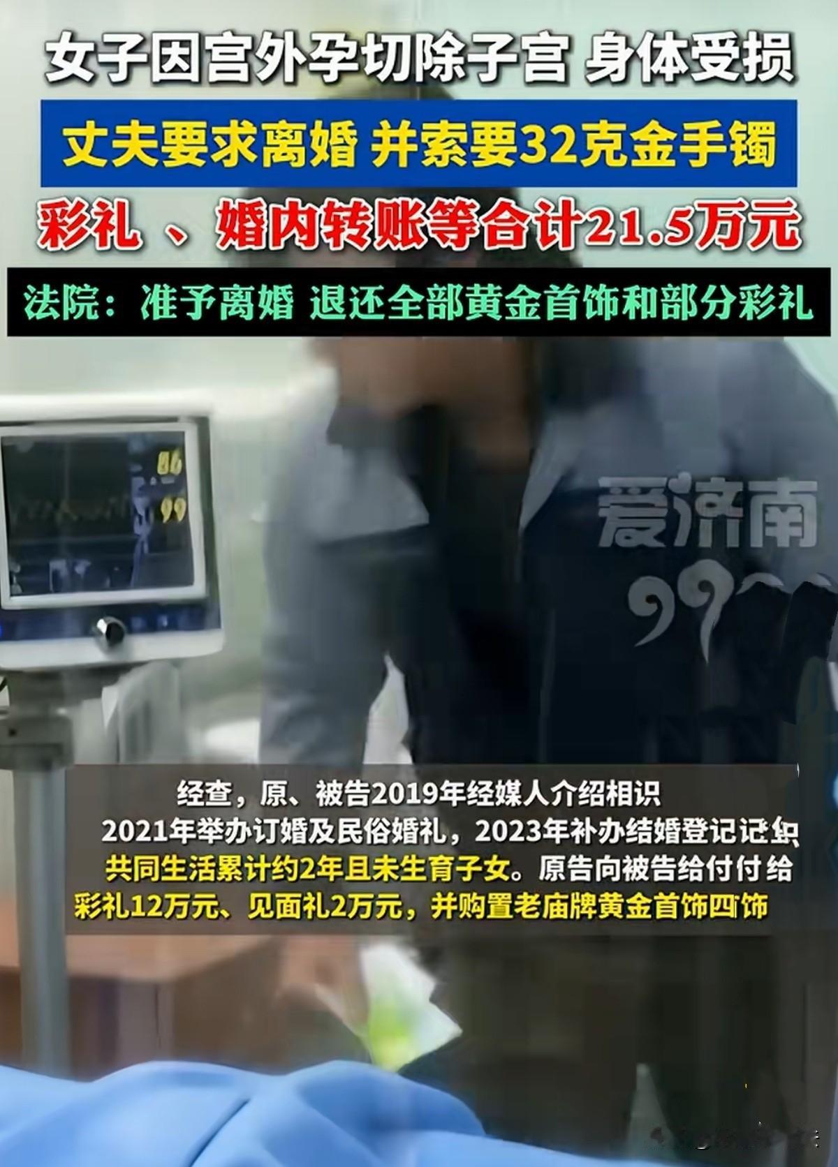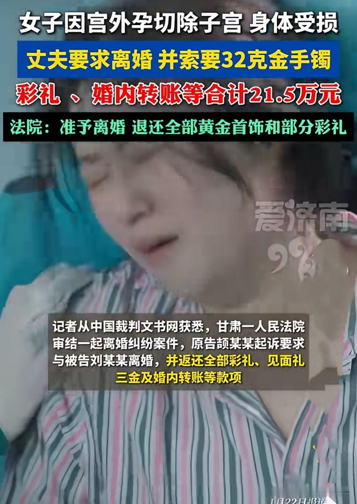 甘肃,女子与丈夫共同生活2年未生育子女,而后女子因宫外孕,切除左侧输卵管及部分子宫,身心很大打击,为养伤与丈夫分居。谁知丈夫将其告上法庭,说双方感情破裂,要求离婚并返还彩礼、见面礼、婚后转款各类款项合计21.5万元及32克黄金首饰。女子认为夫妻感情并未破裂,只是自己被切除子宫,他嫌弃,就多次提离婚,据上次离婚诉讼被驳回都没过一年。然而法院判决让人意想不到! 2019年,身边不少同龄人都成了家,李某的父母看着心里也着急,便四处托媒人牵线。 经媒人介绍李某结识了赵某,两人一见钟情,一开始就是抱着结婚的目的相处,媒人把双方的条件说得明明白白,他们相处下来觉得彼此脾气还算合得来,就给了她2万见面礼,热热闹闹地办了订婚宴。 相处了2年多,2021年双方家里都觉得时机成熟了,李家就按当地风俗,给赵某12万彩礼,还为她购买了4金后办了婚礼。 婚礼办了之后,他们就像寻常夫妻一样住到了一起,可结婚登记的事儿却一拖再拖,总觉得反正仪式都办了,领证只是走个流程。 直到2023年,两人才补办了结婚证。共同生活了两年,他们一直未生育子女。 原本以为日子会慢慢步入正轨,万没想到赵某突然查出宫外孕,还得做手术。可手术切除了她左侧输卵管还有部分子宫,这对一个想做母亲的赵某造成很大的伤害! 赵某躺在病床上,心情特别不好,性情也变得更敏感、更容易烦躁,还经常偷偷地哭。 李某刚开始体谅赵某的心情,也精心照顾她,可生活里的琐事还是越来越多,一点点磨掉了原本就不算深厚的感情。 她术后恢复得不算太好,我们之间的沟通也越来越少,常常为了一点小事就争吵。 赵某总觉得李某不够体谅她的身体,拒绝与他亲近,李某很生气,提起离婚诉讼,被法院驳回。 两人矛盾越积越深,到了2024年5月,赵某为了让身心尽快恢复,与李某分居。 这下,李某更受不了了,认为赵某不在乎他的感受,觉得这日子没发过了。 这段感情已走到头了,再勉强下去对两个人都是折磨,就起诉到法院,要求离婚,还希望她能返还当初我给的彩礼、见面礼还有黄金首饰,算下来大概21.5万元。 赵某坚决不同意离婚,她说两人的感情没有彻底破裂,她因宫外孕手术身体受了很大损伤,李某不仅体谅她养伤还提出离婚,就是嫌弃自己切了子宫,不能生孩子,是个负心的男人。 这次起诉距离上次法院不准离婚的判决还没满一年,他就迫不及待地再次提出离婚,太没责任心了! 李某也有自己的说法,谁的家夫妻分房?没有温情的生活如一潭死水,除了争吵就是冰冷的相处模式,他实在受不了了! 法院审理认为,李某赵某婚后因家庭琐事长期矛盾,还长期分居,而且李某之前也提起过离婚诉讼,这些都说明夫妻感情已实际破裂了,所以最终判决准予离婚。 《最高人民法院关于审理涉彩礼纠纷案件适用法律若干问题的规定》第5条规定:双方已办理结婚登记且共同生活,离婚时一方请求返还按照习俗给付的彩礼的,法院一般不予支持。 ​双方2023年补办结婚登记,共同生活累计约2年,已满足“办理结婚登记且共同生活”的一般不予返还彩礼的前提条件 。 但本案中彩礼及见面礼合计14万元,数额较高,且双方未生育子女,赵某因宫外孕手术身体遭受一定损伤,共同生活时间虽有2年但并非长期,又不属于绝对无需返还的情形,符合“共同生活时间较短且彩礼数额过高”的例外适用前提 。 ​ 法院综合考量共同生活时长、赵某身体受损情况、当地婚嫁习俗等因素,未支持李某全部返还的诉求。 最后法院判决:酌定赵某返还30%,4.2万元,同时退还32克全部黄金首饰。 至于婚内转账,法院认定该款项属于婚姻存续期间夫妻正常经济交往,故对该诉求不予支持。 有人说女方不能生孩子了,男方要求离婚也没错,要是男的不能让女的怀孕,那女的也会提出离婚。 有人很气愤:那请问,女人子宫都切除了,谁来赔偿?凭什么男人全身而退,什么都没有损失?女人就该承担一切? ​ 宫外孕也是男人造成的,女人被切掉了子宫,以后可能都不能生孩子了,彩礼和黄金都不该退,男人应还应给予赔偿才是! 还有人说,如这事是女方婚前行为丈夫未知,那法院判决可以接受!如是婚后和丈夫一起,那不应退回任何结婚费用。 应该赔女方钱,为他怀孕,子宫外孕,谁愿意呀?女人伤害最大,男方还提离婚,为什么受伤总是女人?不该退钱! 对于这场离婚风波,您支持哪方呢?