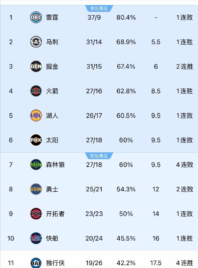 西部最新排名: 1、雷霆:37胜9负 2、马刺:31胜14负,5.5(胜差) 3、掘金:31胜15负,6 4、火箭:27胜16负,8.5 5、湖人:26胜17负,9.5 6、太阳:27胜18负,9.5 7、森林狼:27胜18负,9.5 8、勇士:25胜21负,12 9、开拓者:23胜23负,14 10、快船:20胜24负,16 11、独行侠:19胜26负,17.5 (截止1月24) 这两天,西部第第5→第9都在输球,这对于赢球的火箭和快船来说,都是向上追赶排名的好机会。 尤其是对快船而言,他们需要在附加赛里占据有利的位置,至少拿到第7、第8,先拿到两条命再说,这意味着在快船前列的9个队伍,至少有两个得腾个空位出来,现在看上去,开拓者和勇士都有机会,布克受伤后的太阳,也有可能短期内迎来下滑。 赛季刚过半,本身排名还没有那么重要。但每年的这个时期,是赛季中期交易,人心浮动,很多球队容易掉链子,现在能多胜一些,攒一些家底,赛季后期的容错率也会提升很多。 要真是到了赛季末期,每一场比赛都是打生打死,那时候想要排名上一位,是千难万难了。