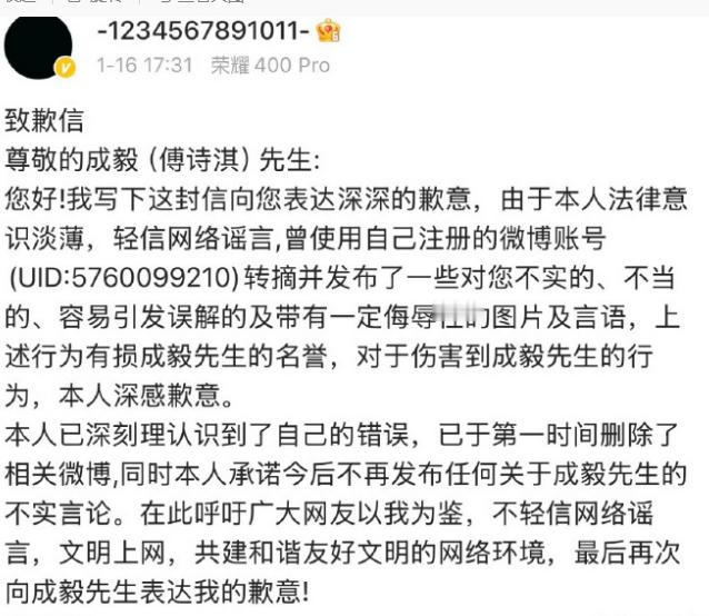 成毅演的好不好是一回事,有人在网上各种诋毁谩骂就是另一回事了首先,这个所谓的道歉信,一点诚意都没有,ID改了,也没实名,没手写,不和解,希望赔偿,走法律途径,该进去进去,该赔偿赔偿,还要实名或者视频道歉,赴山海时成毅和粉丝受到的网暴太深了,没法原谅收到传票了,只能说成毅的提告是真告,前面的几个都陪偿巨额赔款,这个不会落下,涉及刑事的也跑不掉