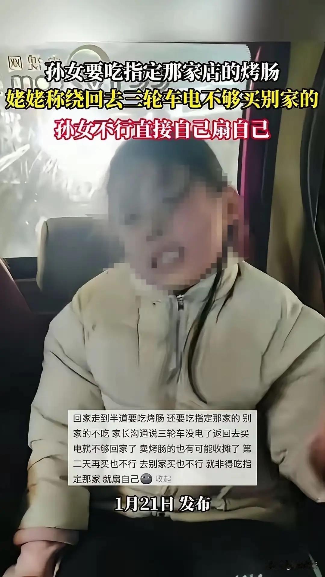 “决不手软”!一网友发布视频,姥姥接外孙女放学回家,孙女半道上想吃烤肠,还指定必须吃那家的。姥姥说再折返回去买烤肠,电瓶车电就不够回家的。劝说明天给买不行,换一家给买也不行。孙女见姥姥不给买,居然用手扇脸,一直不停扇脸,脸都扇红了,但就是咬着牙继续扇! 放学的人流还没散去,路边的小摊贩吆喝声此起彼伏,那家烤肠摊前正排着不长的队伍,香气飘得老远。姥姥牵着孙女的手,电瓶车停在路边,她反复指着车上的电量显示给孙女看,指针已经快要靠近红线,语气满是无奈又带着心疼:“乖宝,你看电真的不够了,咱明天一早过来买,刚出锅的更热乎。”可孙女根本不听,使劲甩开姥姥的手,站在原地跺脚哭闹,嘴里反复喊着“就要现在吃,就要那家的”。 姥姥耐着性子又劝了半天,说附近别家也有烤肠,味道差不多,姥姥多给你加根火腿肠,可孙女认准了那家,头摇得像拨浪鼓,情绪越来越激动。见姥姥始终不肯松口,她突然扬起小手,朝着自己的脸颊狠狠扇了下去,“啪”的一声脆响,引来了周围路人的注意。一下、两下、三下,她越扇越用力,稚嫩的脸颊很快泛起红印,眼眶也红了,却依旧咬着牙不停手,眼神里满是执拗和威胁。 姥姥瞬间慌了神,赶紧伸手去拉孙女的手,声音都带着颤抖:“别扇了别扇了,姥姥给你买,这就给你买!”她急得直跺脚,一边拉着孙女往烤肠摊走,一边回头看电瓶车,满脸的纠结和担忧。周围路过的家长和行人也纷纷围过来,有人劝孩子“不能这么任性,姥姥也是为了你好”,也有人低声议论“这孩子也太惯着了,想要啥就得给啥”,还有人好心提醒姥姥“实在不行推着车回去,别委屈了孩子”。 姥姥没心思理会旁人的议论,快步走到烤肠摊前,给孙女买了两根她指定的烤肠,还特意让摊主多刷了点酱料。拿到烤肠的瞬间,孙女立刻停止了哭闹,也不扇脸了,接过烤肠就大口吃了起来,脸上的红印格外显眼,却一脸满足。姥姥看着孙女吃烤肠的样子,伸手轻轻摸了摸她泛红的脸颊,叹了口气,眼底满是心疼和无奈,再也没提电瓶车电量的事。 路上,孙女开心地跟姥姥分享烤肠,姥姥却一路愁眉不展。她后来跟拍视频的网友念叨,孩子爸妈常年在外打工,把孩子托付给她带,她总觉得亏欠孩子,孩子想要的东西,只要能满足,从来不会拒绝。平时在家,孩子要零食给零食,要玩具买玩具,就连吃饭都要追着喂,久而久之,孩子就养成了任性的脾气,稍不顺心就哭闹撒泼,这次居然学会了扇自己脸逼她妥协,实在让她又气又疼。 其实这样的场景,在生活中并不少见。很多老人带孩子,总想着弥补孩子缺失的父母陪伴,把所有的爱都化作物质满足和无底线纵容。家长们忙于工作,也总觉得亏欠孩子,回家就用零食、玩具哄孩子,从没想过给孩子立规矩,更没教过孩子学会体谅他人、接受拒绝。孩子习惯了被无条件满足,一旦需求得不到回应,就会用极端的方式达到目的,却不知道这样的任性,只会慢慢毁掉自己。 视频发到网上后,网友们议论纷纷。有人说“隔代亲不是无底线宠溺,这样的爱会害了孩子”,也有人说“孩子的父母该反思,不能把带娃全推给老人,教育更不能缺席”,还有人说“要从小给孩子立规矩,让孩子知道不是所有要求都能被满足,学会尊重他人的难处”。后来孩子爸妈看到视频,特意从外地赶回来,和姥姥一起给孩子做思想工作,告诉她不能用伤害自己的方式提要求,要体谅姥姥的不易,还陪着孩子给姥姥道了歉。 真正的爱孩子,从来不是无底线的纵容和满足。隔代亲的温暖很珍贵,却不能变成宠溺的借口;父母的陪伴缺失可以弥补,却不能用物质和纵容替代教育。教会孩子体谅他人、遵守规则、接受拒绝,才是对孩子最好的保护,这样的孩子才能更好地适应生活,长成有温度、有分寸的人。 各位读者你们怎么看?欢迎在评论区讨论。