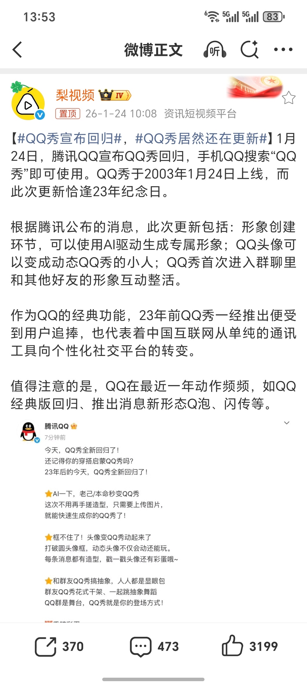 QQ秀宣布回归QQ秀真的是回忆杀了…可是我的QQ都不用了当年红钻、黄钻、紫钻,那都是身份的象征现在朋友可能都不知道 为了挂QQ升太阳把自己的号和密码都直接给别人现在想想挺疯狂