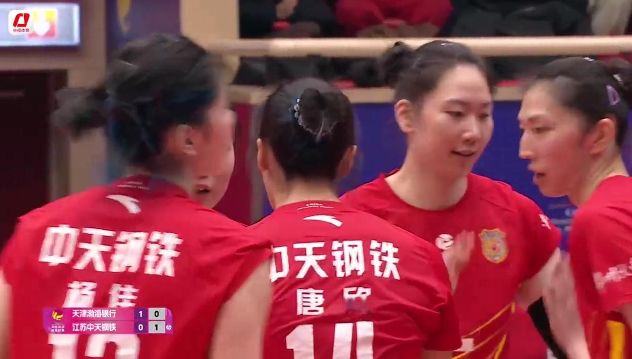 【女排超级联赛】第十一轮:天津——江苏 实时战况: 1月24日下午15:30分,全国女排超级联赛常规赛第十一轮天津——江苏的比赛在天津队主场打响。第—局开始,1:3,江苏领先。2:3,2:4,周页彤前交叉。2:5,天津触网。2:6,吴梦洁打手出界,天津暂停。3:6,天津快攻。4:6,吴梦洁下网。5:6,天津后攻。6平,天津追平比分,江苏暂停。6:8,唐欣。7:8,吴梦洁扣球出界。8平,9平,11:9,刘美君打探头,天津反超,江苏第二次暂停。11:10,12:10,13:10,天津领先。天津14:12领先。15:12,16:12,16:13,周页彤。16:14,天津第二次暂停。17:14,18:14,刘美君。18:15吴梦洁。19:15,19:16,20:16,21:16,22:16,22:17,22:18,23:18,24:18,25:18,天津胜第一局,大比分1:0,天津领先! (另一场比赛,山东大比分1:0领先河南) 第二局比赛正在进行中……