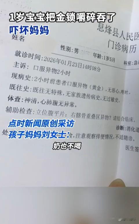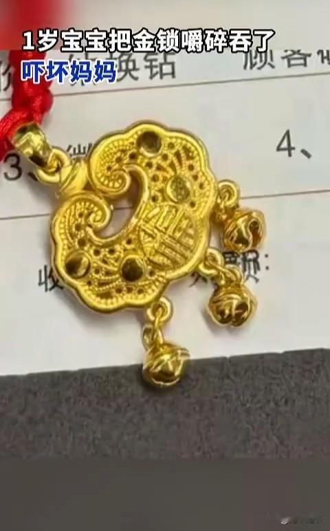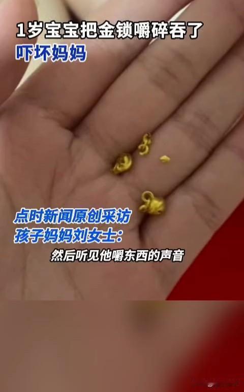贵阳有位一岁半的“吞金兽”😨 26年1月24日凌晨,刘女士关灯准备休息时,听到孩子发出咀嚼声,开灯发现儿子正啃咬佩戴的金锁,三个铃铛已被咬碎。她立即抠出孩子口中残留的金屑,但怀疑仍有部分被吞入腹中。次日孩子出现食欲减退,刘女士带其就医拍片。检查显示黄金碎片已进入大肠,医生确认暂无生命危险,叮嘱家长通过观察后续排便确认异物是否排出,并需按医嘱复查。 虽然老话有“吞金自杀”的传言,但在现实中黄金化学性质稳定,基本不被胃肠道吸收,通常会随粪便自然排出(但物理风险不容忽视,尖锐碎片可能划伤消化道。)宝宝不慎吞下异物该马上到医院检查(X光)等,若卡在消化道里面需要靠手术取出。宝妈切记用土办法催吐,避免二次伤害。 提醒家长都引以为戒,生活中三岁以下的幼童避免佩戴含小零件的饰品,如果非要配戴可以选择实心光滑款式。