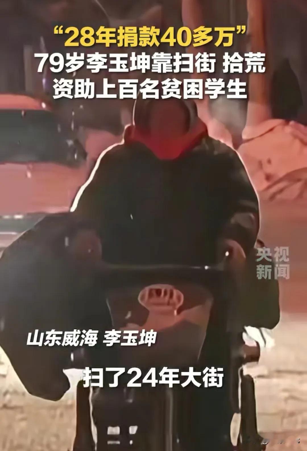 “感动了央视!”山东威海,79岁大娘,扫大街24年,28年内捐款40多万,资助了上百名贫困学生,受资助的学生,一直来信称她为伯伯,直到见到本人,他抱着大娘,泪哭道:我一直以为你是坐办公室的干部,没想到,你是扫大街的。 28年了, 李玉坤始终坚守着自己的初心,尽自己的一份微薄之力,资助贫困学生,能帮多少是多少。 她资助的学生,有一些信息是从报纸上看到的,只要看到有要资助的学生,她就会资助,有一些,她是去慈善总会看到的,她用着自己的方式,资助着这些学生。 24年来,为了能够不断地资助贫困学生,她一直坚持扫大街,得来的每一分钱,她都会资助到贫困学生手上。 有一位贫困学生,他已经连续受资助4年了,四年来,他一直以为资助他的,是一个坐办公室的干部,手上有余钱,所以能够资助他。 他一直有写信感激李玉坤,信中他喊道:李伯伯。 李玉坤从来没有跟这个贫困学生说出自己的真实身份。 直到这个贫困学生来见她,看到她是一个大娘,贫困学生满脸的震惊,资助他4年的这个人,居然是一位大娘。 她并不是坐在办公室里的干部,而是扫大街的一名环卫工,拿着微薄的工资,正在资助着他的学业。 她抱着大娘哭道:“真没想到,你是扫大街的,拿扫大街的钱来供我读书。” 说完这句话,那一刻,受资助的贫困学生,,喉咙哽咽了,再也说不出话来了,眼里蓄满了泪水。 李玉坤看着自己资助的学生,默默地继续去扫大街,她还要使劲地干,她要继续资助贫困的学生。 这28年来,她除了默默地工作,默默地支持着贫困学生,她在生活上非常节俭,她的一件衣服就穿了20多年,衣服烂了都舍不得丢掉。 这28年,她几乎不买衣服,她省下的每一分钱,都想用到贫困学生身上。 她说,她不觉得她做的这些事伟大,她只是做了自己能做的,做了自己该做的事情,她要使劲干,直到干不动的那天为止。 李玉坤如此执着,因为她曾经也是一名贫困学子,她深知贫困学子的不易,她想尽自己的一份力量,在贫困学生的求学路上,点燃一盏灯。 她用28年的坚持,28年的付出,一共给上百名的贫困学生,捐助了40多万,这是一件了不起的事情。 她心善,她伟大,用自己的行动,证明自己的价值。 她甚至已经为自己死后做好了打算, 她说,身为贫困学子,逝为医学献身,她已经签订了遗体捐赠协议。 她想用自己的一生,证明自己的价值。 这是一个最朴素的人,她做着最伟大的事,她用扫大街的钱,温暖了无数的人,她当之无愧,是感动中国的人物,是感动中国的好人。 李玉坤的事迹,平凡却又伟大,一个人,能用28年的时间,坚持一件自己认为有意义的事情,她慷慨解囊,点亮贫困学生的求学道路,她深知学生才是未来,也深知贫困学生,经济上的窘迫,需要得到他人的资助。 她放弃对生活的追求,拼命地干活,只为心中的信念。 她之所以感动着大家,因为李玉坤真的是一个很朴素的人,更是生活非常低调的人。 她工作不易,收入微薄,却坚持着自己善意的信念,正是这一份善意,正是这一份执着,让大家从平凡的人物身上,看到了人性的闪光。 李玉坤的事迹之所以感动着大家,是因为,她身为一个朴素的人,做着平凡的工作,她只有微薄的收入,也要倾囊相助他人,这就是善良的力量。 她正用自己微薄的力量,感动着大家,影响着大家。 李玉坤的行为,实际上是属于道义上的捐赠,她捐出去的钱是不可以撤回的。 《民法典》第658条第1款规定:赠与人在赠与财产的权利转移之前可以撤销赠与,这被称为任意撤销权。不过,此权利存在适用范围限制,不适用于经过公证的赠与合同或具有救灾,扶贫,助残等公益,道德义务性质的赠与合同。 当然,善良的李玉坤,她28年来坚持这一件事,是没有想过要回报的,她只想着让这些贫困学生,有朝一日学业有成,回馈社会,这就是她的初心。 那么你对李玉坤有何感想?