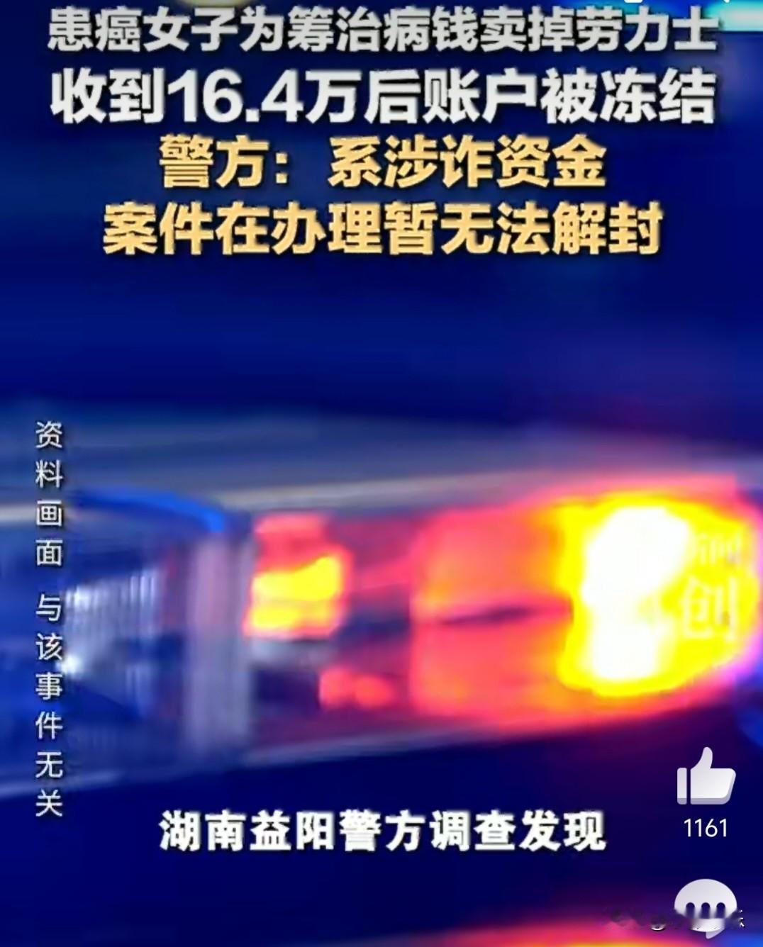 “嗯,是病情重要还是案情重要”?怎么能让救命钱被冻住呢? 西安一位女子患恶性肿瘤转移,走投无路卖掉劳力士筹了16.4万治病钱,结果钱刚到账,账户就被湖南警方冻结,理由是这笔钱是电诈涉案资金! 这有点人财两空的意味了,手表没了,治病钱取也不出来,女子家人快急疯了:我们都是按流程走的,怎么会这样呢? 普通人卖个贵重物品,怎么知道对方给的钱是干净是脏,我们能查得出来吗?为了治病才急着卖表,线下交易也是想着一手交钱一手交货更稳妥。还是入了坑。 这个案子跟之前那个卖小麦的如出一辙。 现在情况是女子已经癌症转移,急需钱化疗,可警方说案件还在侦办,账户暂时解不了封。 家人也提供了交易视频、聊天记录证明清白,可还是没用,甚至被提议和电诈受害人协商退部分钱换谅解书, 一边是重病患者的救命刚需,一边是警方打击电诈的法定程序,双方该如何平衡? 但话说回来,正常人谁能想到买表的钱是赃款?难道以后卖东西前,还得先让对方出个“资金合法证明”? 你觉得该先解封救命钱,还是先办案件?评论区聊聊~