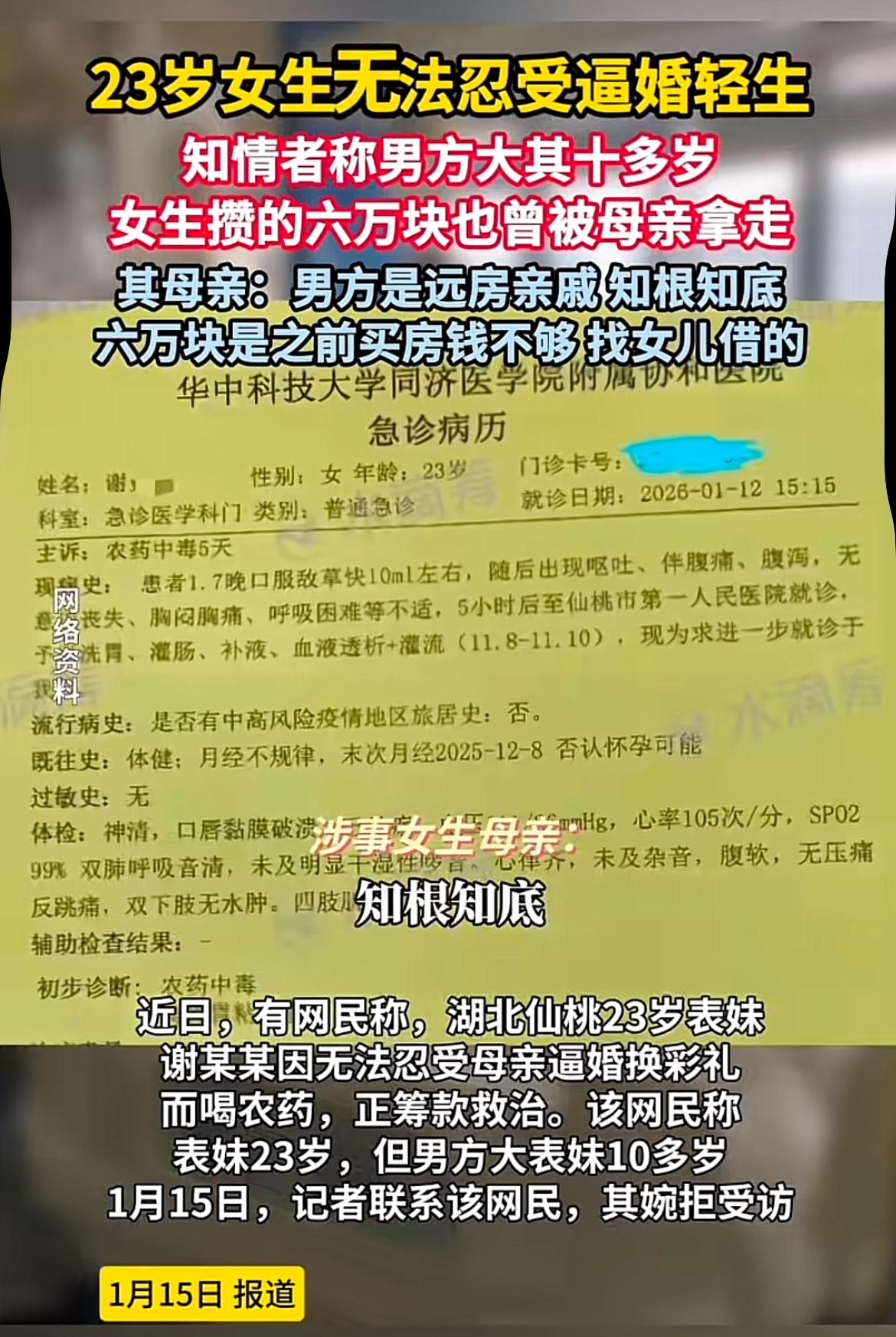 23岁女生因无法忍受逼婚而轻生,这事儿真让人痛心。23岁,多美好的年纪,本应自由自在地去追逐梦想,却被逼婚的压力压得喘不过气。 现在很多家长,总觉得孩子到了一定年龄就得赶紧结婚,根本不考虑孩子自己的想法。就像这个女生,也许她还想多花点时间在事业上,或者还没遇到那个对的人。可在家长的不断逼迫下,她最终走向了绝路。 婚姻本应是爱情的归宿,而不是被外界压力强行推动的结果。希望家长们能多给孩子一些理解和空间,让他们能在合适的时候遇到真正属于自己的幸福。