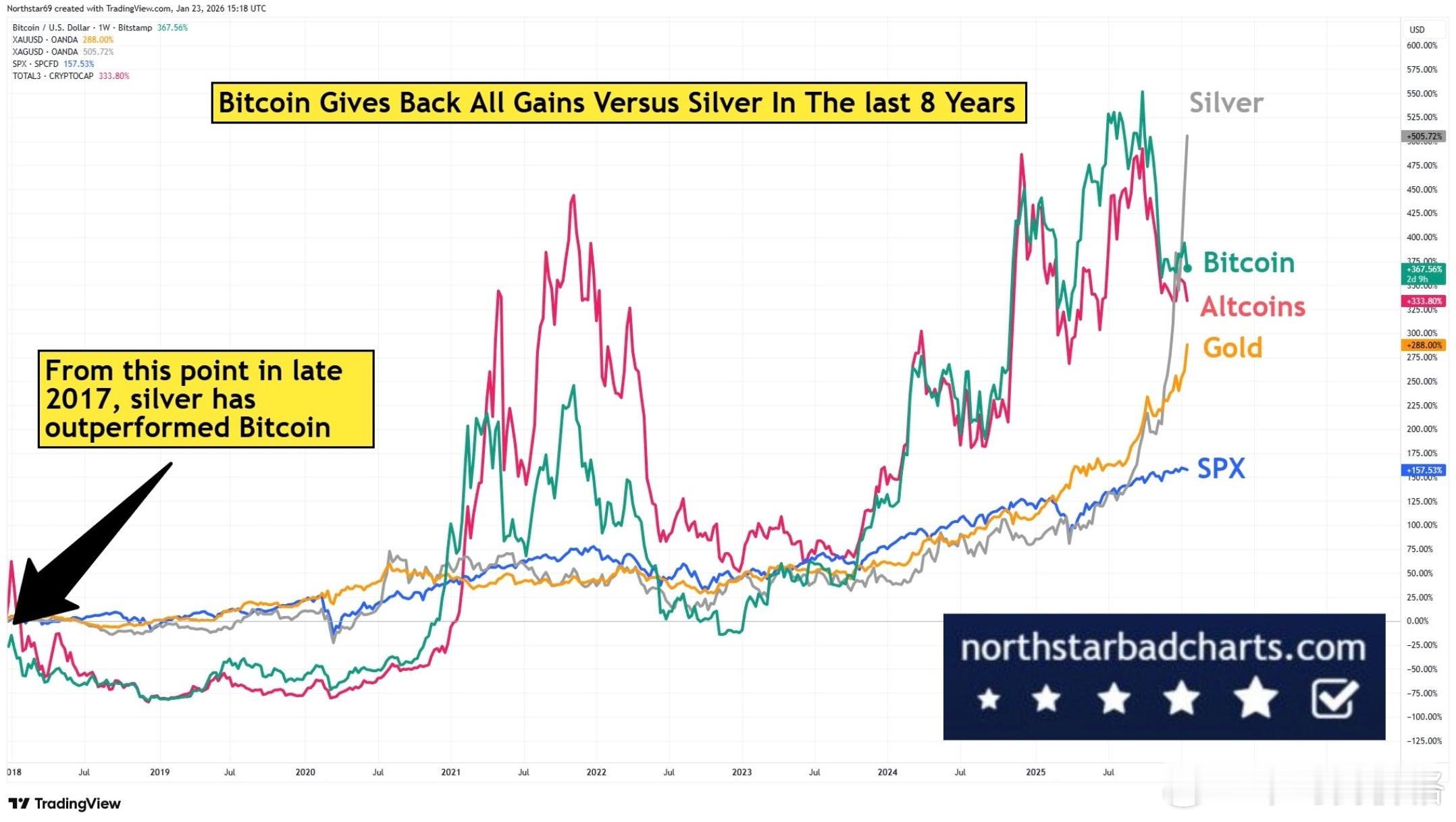 白银过去8年涨幅已经超过了比特币,而其中大部分涨幅贡献来自过去1年。