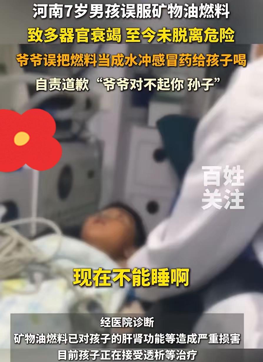 郑州7岁娃喝口“矿泉水”躺ICU!你家饮料瓶可能藏着“夺命陷阱” 谁能想到,桌上一瓶普通的“矿泉水”,竟差点要了7岁娃的命!刷到这新闻我后背直冒冷汗,这事真得给每家每户敲敲警钟。 河南郑州的娃感冒了,爷爷心疼得赶紧冲药,随手抄起桌上一瓶“矿泉水”兑温水。娃喝一口就咧嘴:“这水味儿不对!”可爷爷光顾着让娃快点好,没当回事。结果半小时不到,娃吐得直不起腰,眼神飘得像没睡醒,整个人软得像滩泥。 送医后查出急性肝衰竭、肾衰竭,直接进ICU抢救!原来那瓶子里根本不是矿泉水,是孩子爸爸从火锅店要来的矿物油燃料,想煮火锅解馋,随手一放就忘了说。 说真的,爷爷和爸爸哪儿是要害孩子,一个疼孙子,一个爱家人,纯属好心办了塌天大事。但你家是不是也这样?饮料瓶装清洁剂、矿泉水瓶装酒精,总觉得“我记着就行”。 我国每年近万名娃误服有毒液体就医,六成都是因为这破习惯!老人记性差,孩子啥都敢尝,一个不留神就出大事。 听句劝,危险液体别往食品瓶里装,要么贴大标签,要么锁高处。别图省事儿,把家变成藏着隐患的“雷区”,生命可没有试错机会!