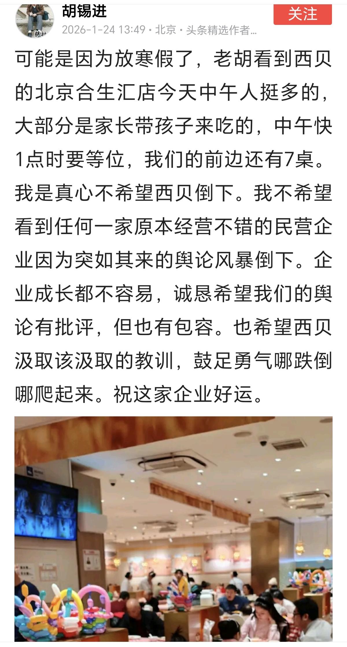老胡刚发了一篇微头条,说他去西贝在北京的某家门店吃饭,中午的时候有不少家长带孩子去吃,而且还要排队等。 我有点纳闷,这些家长是在这场风波之后故意去品鉴一下西贝菜品,或者本来就是那家西贝店的忠实顾客? 我觉得现在仍然选择去西贝餐厅吃饭的应该是以下两类顾客: 一是,他们本来就是西贝的忠实粉丝,不管发生了什么,他们就是喜欢吃那一口。 二是,有点赶时间,只图上菜快,对价格和口味没多少要求的顾客。 老胡呼吁,他不希望一家原本经营不错的民企在一场舆论风波之后关停。 我觉得西贝能不能挺过这一关不在于网友们怎么说怎么论,也不在于媒体的导向是什么,而在于西贝自己的选择。 如果西贝能认真吸取教训,积极改进,从跌倒的地方爬起来了,就没人能让它再倒下去。 不管网友们怎么说,他们就是潜在的西贝顾客,是否进西贝的店里吃饭,会有自己的选择。 他们不会为了某个观点的输赢做出消费的选择,而是谁能征服他们的舌尖就选择谁。 对于自己喜欢的餐厅,拦也拦不住,该去还是要去; 相反,消费者没有义务要包容一家自己不喜欢的餐厅,为了去而去。 西贝目前已经完成新一轮融资,而且官媒也对此事发了第6篇评论。 对于西贝来说,接下来的一段时间是关键,该怎么应对舆论和市场的反应,确实需要谨慎对待了,留给他们的时间或许不多了。
