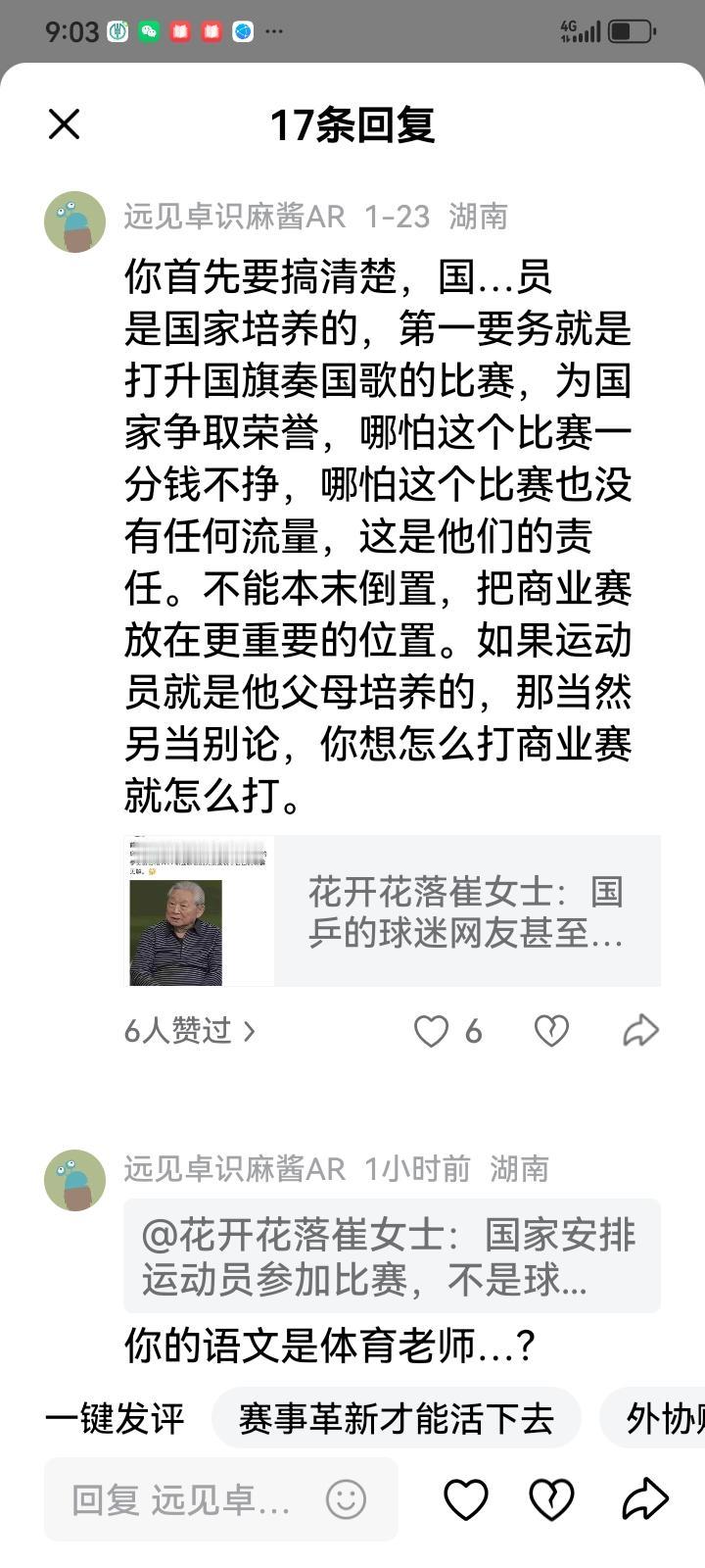 看这位网友的主页是支持王励勤主席的,她说运动员是国家培养的,第一任务是打升国旗奏国歌的比赛,为国家争荣誉,哪怕是这个比赛一分钱不挣,哪怕是这个比赛没有任何流量,这是运动员的责任,他们不能把商业赛放在重要位置[捂脸][捂脸][捂脸]如果父母培养的可以去打商业赛。 问一下这位网友,升国旗奏国歌的运动员没去参赛吗,没拼尽全力吗?没为国争光吗?没放在重要位置吗? WTT商业赛是运动员自己选择的吗?是国家队乒协领导选择的,骂运动员有意思吗?正因为运动员是国家培养的,他们才义不容辞的服从国家队乒协领导安排,安排他们打什么比赛,就打什么比赛。骂运动员去打WTT商业赛合理吗?运动员身不由己的去辛苦比赛结果还被骂。[捂脸][捂脸]