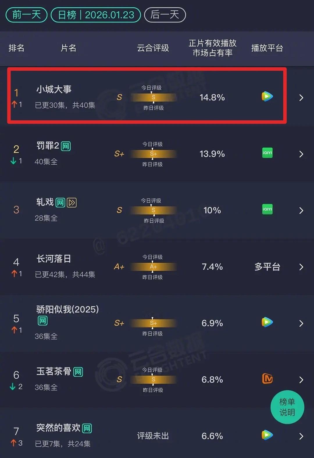 赵丽颖、黄晓明《小城大事》云合终于登顶了☝️,评级S级