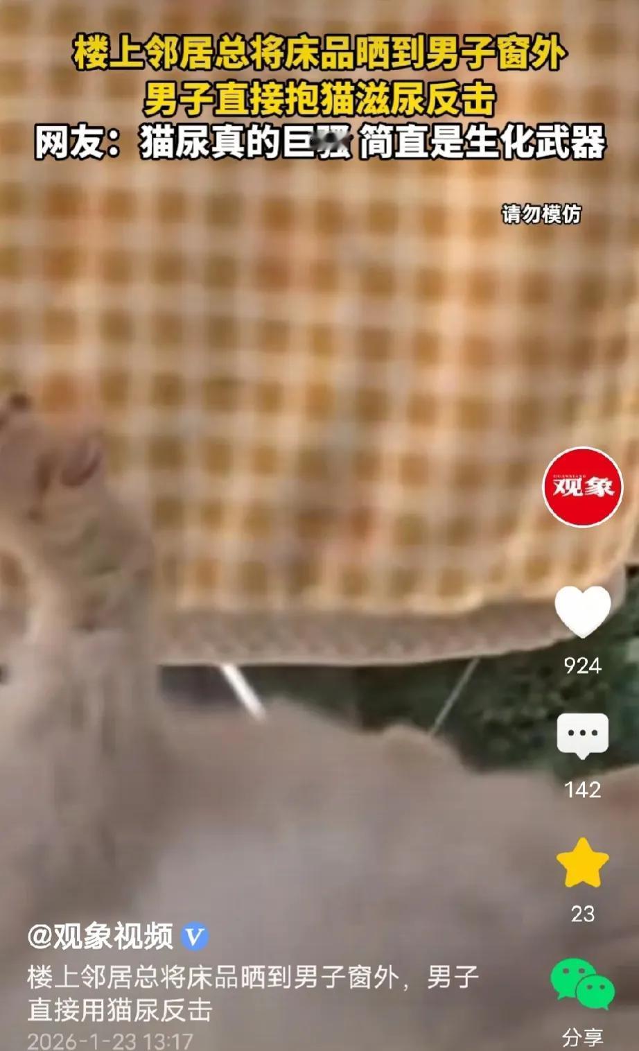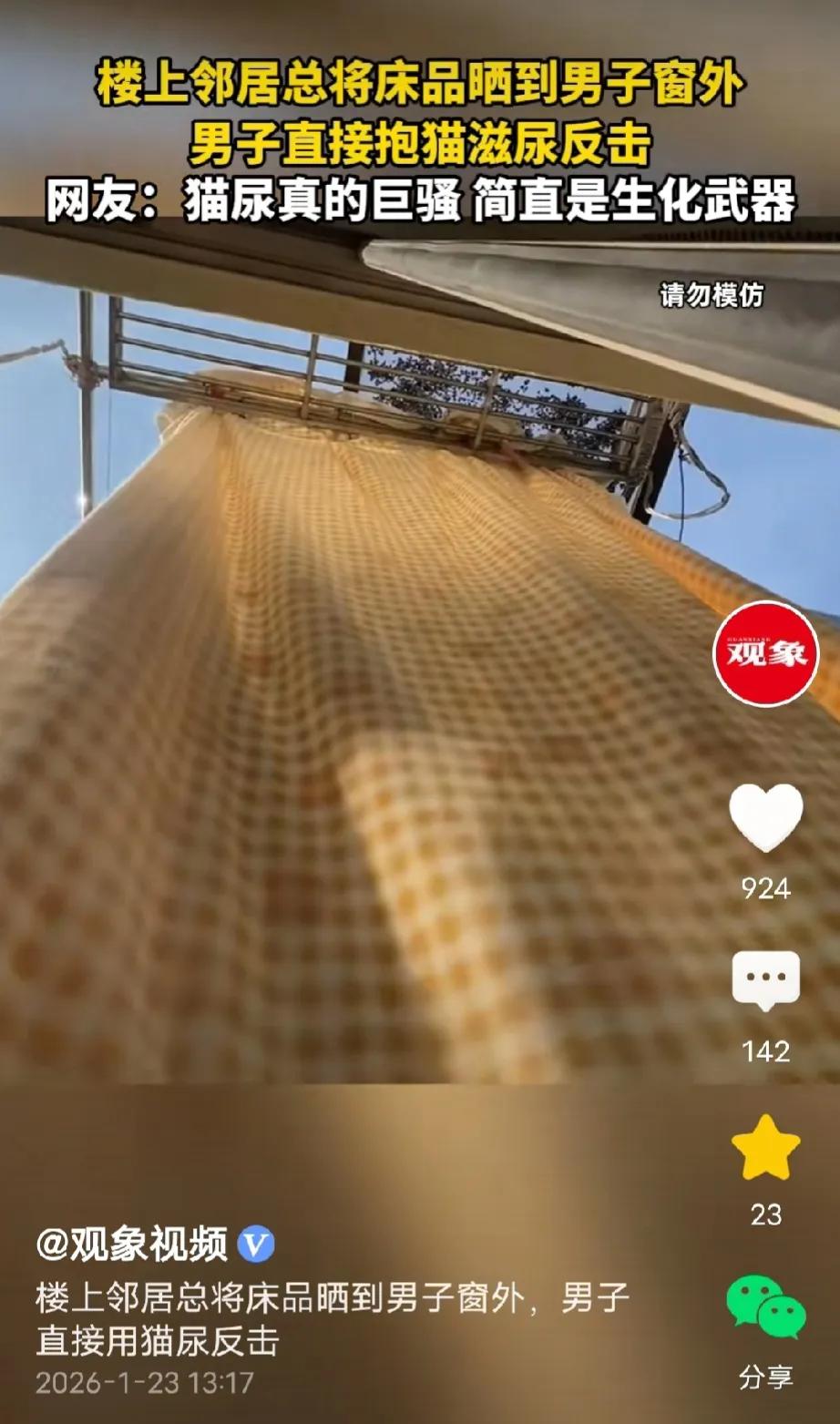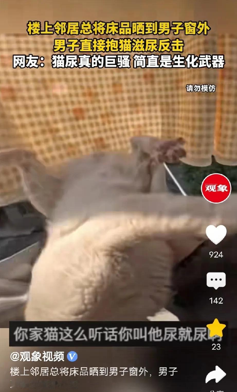 上海,男子回到家发现,屋里暗暗的,往窗外一看,楼上邻居的床单把他的窗户盖了一大半,直接把他家进光的地方遮得密不透风,男子气坏了,一次两次他可以忍,可三番五次就被遮光他受不了,气愤之下,他抱起正在尿尿的小猫,对着楼上邻居的床单一顿扫射。网友: 对付没边界感的人就得这么治! 俗话说远亲不如近邻,如果邻里之间,相互体谅,和睦相处,确实比远在天边的亲戚强。 但是如果遇到没边界感,只顾自己方便,不顾别人感受的邻居,那也很闹心。 1月22日,据观象视频报道,一男子出门回到家,发现屋子里暗暗的,很压抑,他忍不住往窗户外看。 这一看,可把他气得不轻,只看到窗户外,一张长长的床单从楼上阳台直直地往下坠,像从天而降的有色瀑布。 那床单垂下来直接把男子家的窗户盖住了一大半,风进不来,光也透不进,男子家直接成了小黑屋。 外面天气晴朗、风和日丽,本该亮堂堂的屋子,直接被邻居的床单遮成了黑屋子。 本来大家都是邻居,退一步海阔天空,忍一忍也就过去了,又不是多大的事。 可偏偏这个邻居就是这么没边界感,他只图自己方便,不顾别人感受。 一次两次男子可以忍,可他三番五次,隔几天就来这么一招,男子受不了。 原本当初选这套房子,就是看它采光好,现在被邻居这么一搞,直接成了采光差的房子,有窗户也成了摆设。 这大冬天的,好天气本来就少,好不容易碰到天气好的一天,想呼吸呼吸新鲜空气,也让太阳照进家里,晒晒家里的霉气,可被邻居这么一整,直接是天天这么暗无天日了。 男子曾跟邻居沟通过,但是效果不佳,有些人你跟他讲理根本就没用。 男子觉得,自己该来点狠的,教训一下邻居。 正想着,不知道用什么方法对付他的时候,男子突然发现自家小猫在尿尿。 他灵机一动,抱起尿尿的小猫,对着邻居的床单一顿猫尿扫射。 那味道光靠近就受不了,别说铺在床上睡了,既然你不仁也别怪我不义了,看你以后还要不要把东西晒到人家窗台。 只要你继续晒,我有的是方法对付你。 有人说一看到这个,就想到我那可恶的邻居,整得好像整个楼道都是他家的一样,东西都堆到我家门口了,有用的没用的堆得像座山,这种又该怎么治。 还有的说,我的邻居养了几只狗,狗狗到处拉尿,一出门就一股尿骚味,跟他说,他还凶你。 遇到不讲理的邻居,就该用不讲理的方法去治他。 太支持这男子了,这波猫尿,属于精准反击,以其人之道还治其人之身,猫尿浇床单,遮光的代价直接拉满! 本来还想劝男子好好沟通,结果看到是三番五次,瞬间觉得这波操作爽到飞起,对付没边界感的人就得这么治! 如果床单主人报警,男子这波操作算不算违法? 根据《民法典》第1165条规定,行为人因过错侵害他人民事权益造成损害的,应当承担侵权责任。 本案中,邻居反复垂床单遮挡男子家通风采光,虽存在侵权行为,但男子明知猫尿会污染床单仍故意抱猫扫射,主观上具有报复过错,客观上造成邻居财物受损,符合该条款“过错+侵害行为+损害结果”的构成要件,需承担清洗或更换床单的民事赔偿责任。 同时结合《治安管理处罚法》第59条规定,男子故意损毁他人财物,若邻居报警,公安机关可根据情节对其处以拘留或罚款。 男子“以暴制暴”的反击方式无法免除自身违法责任,合法权益应通过调解、诉讼等正当途径维护。 男子的做法,看着解气实则得不偿失。 邻居反复遮挡采光,确实是漠视他人权益的自私行为,男子完全可以通过物业调解、报警协调或民事诉讼等合法途径维权,既能维护自身利益,又能避免陷入违法困境。 可他偏偏选择以暴制暴,用污染他人财物的方式报复,直接从采光权被侵害的受害者,变成了需要承担民事赔偿甚至治安处罚的违法者。 他的这种“以错制错”的方式,不仅解决不了邻里矛盾,反而会让冲突升级,还得为自己的冲动买单,实在得不偿失。 遇到不讲理的邻居,保持理性、走合法途径,才是真正的明智之举。 大家认为呢?