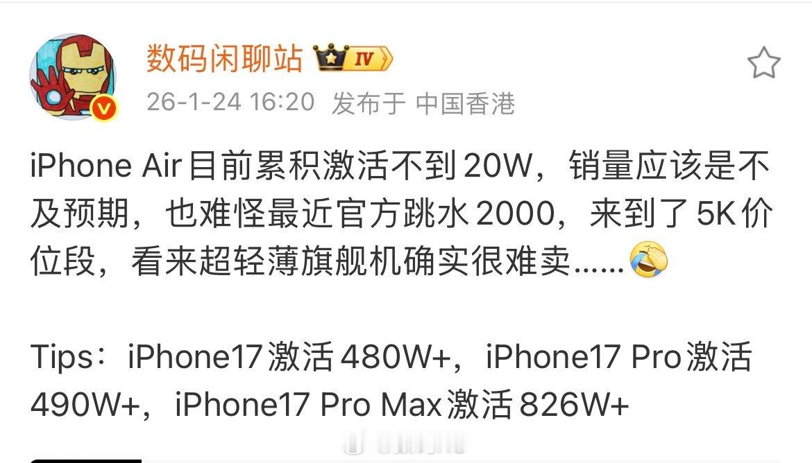 iPhone Air官方价格暴跌2000元iPhone Air官方价格暴跌2000元,现在5499都能拿下,不知道首发用户看到这样的价格如何感想,截至目前iPhone Air目前累积激活不到20W,对比下来买的人是真少,用户不买账。