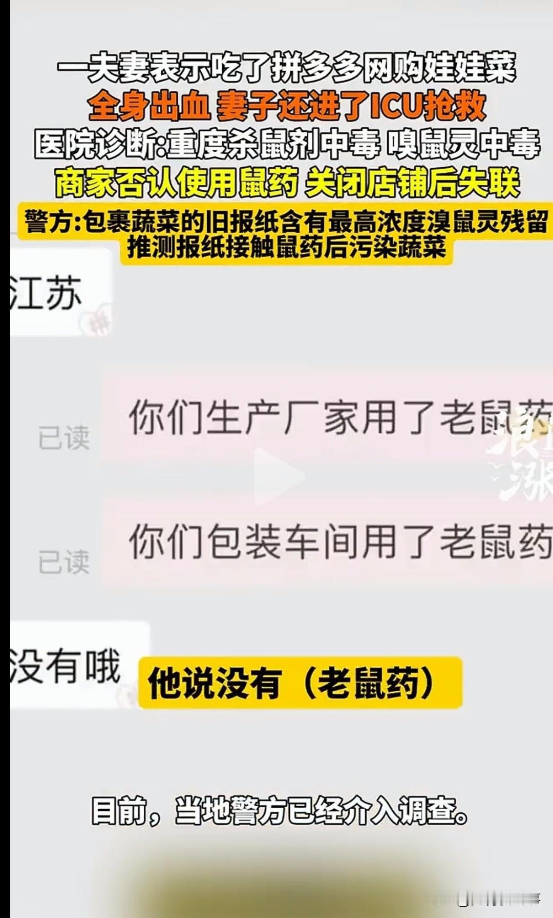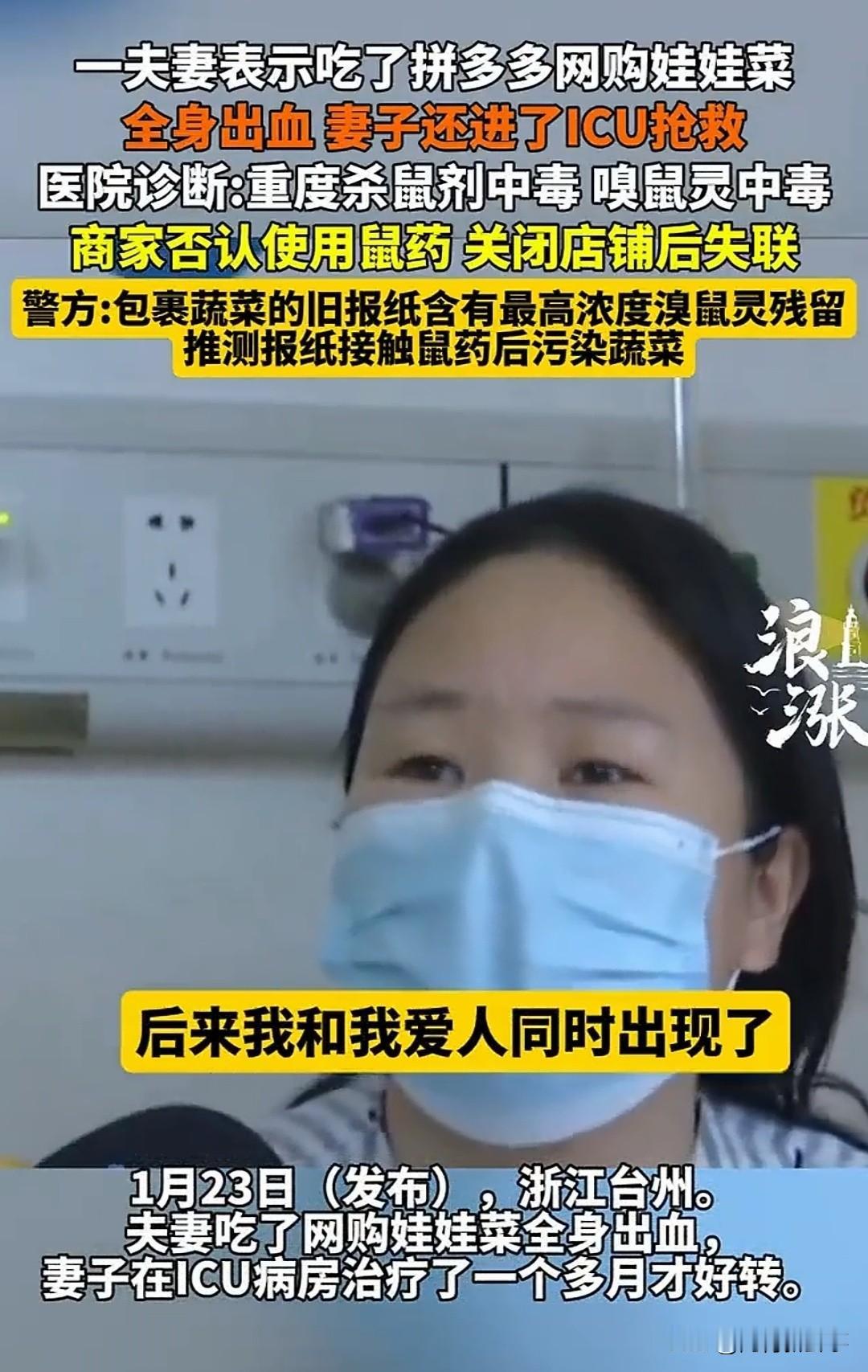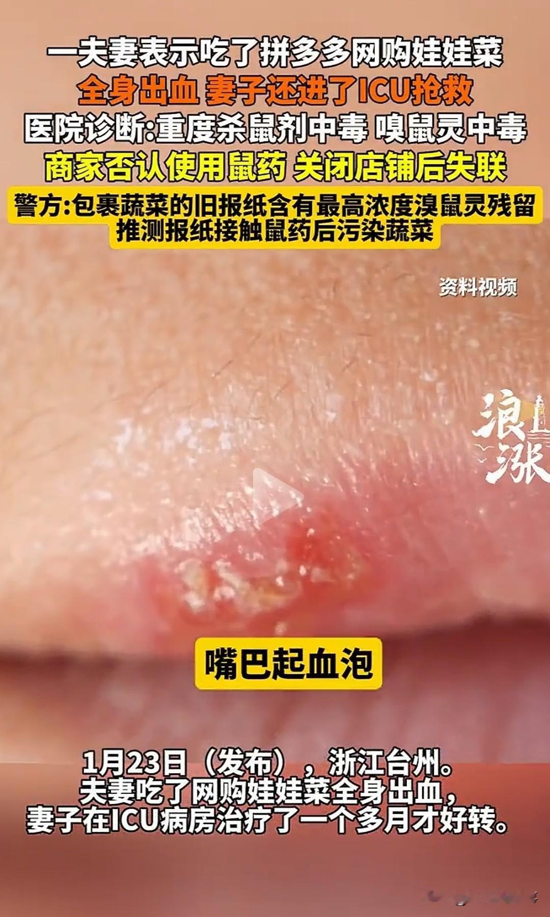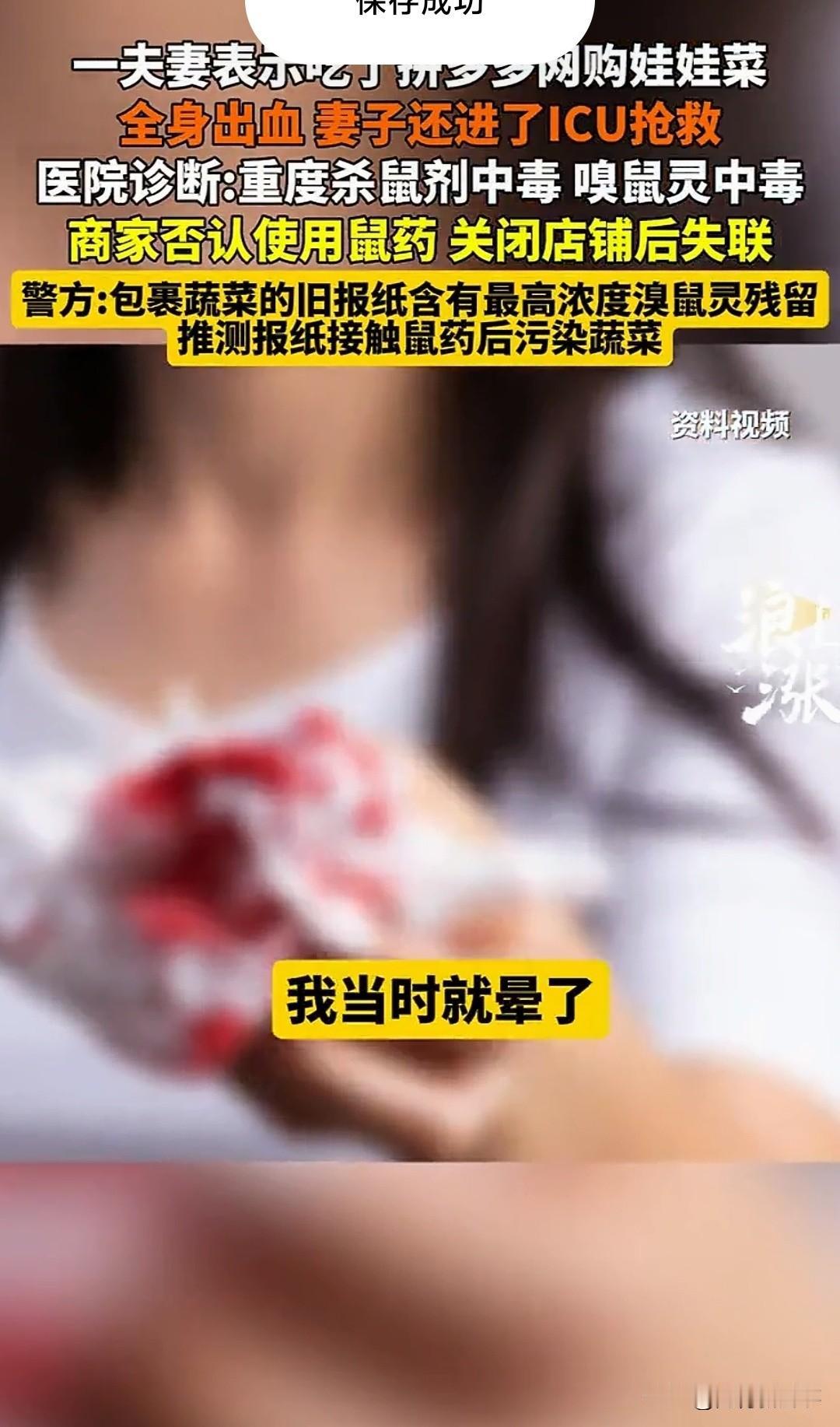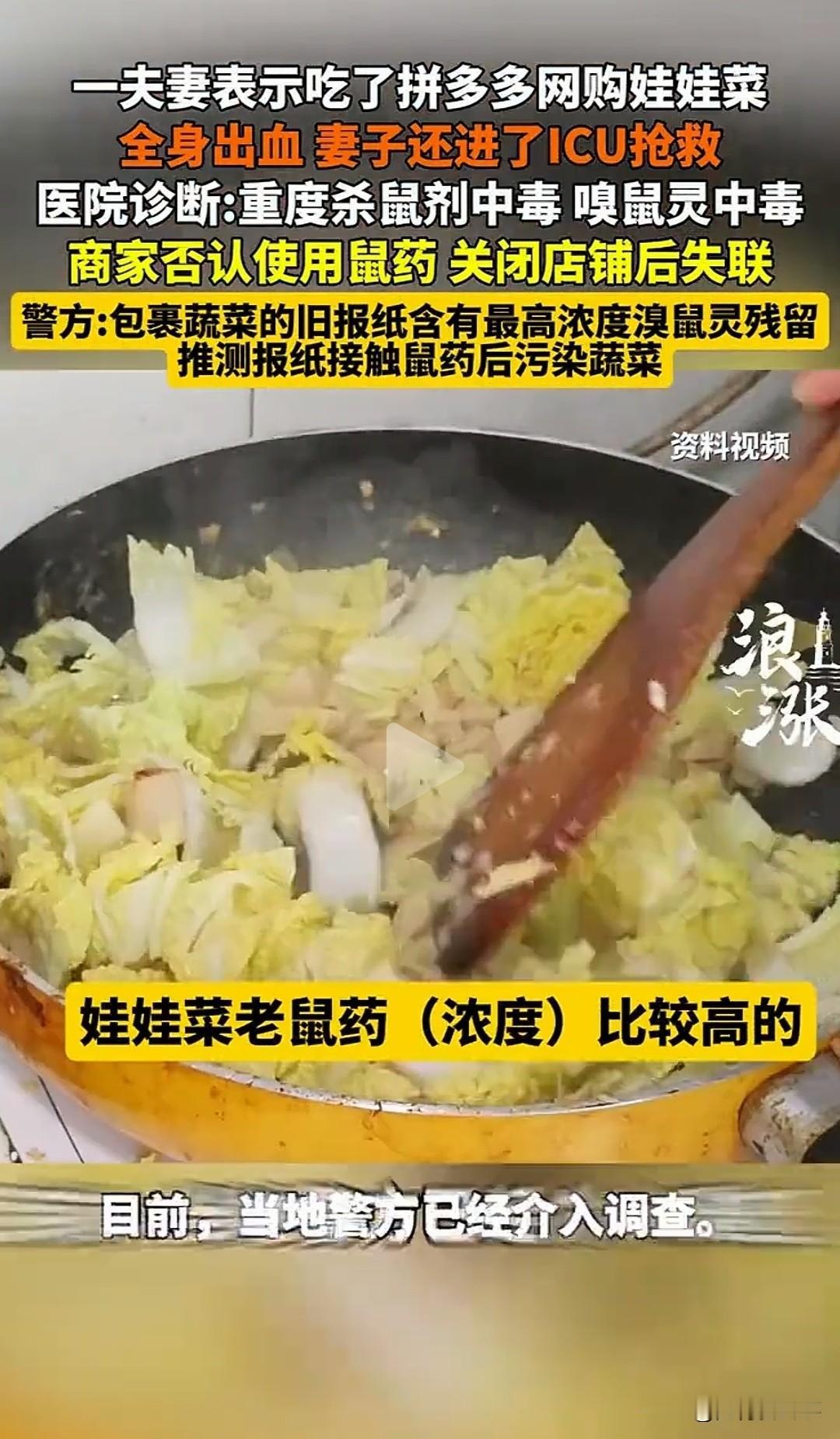 网购娃娃菜吃出血!旧报纸包裹藏毒,17元菜险夺命? 刷到浙江夫妻的遭遇,我真的吓出冷汗!17块网购8斤娃娃菜,清水煮着吃,竟让两人全身出血。 妻子牙龈渗血、指甲缝流血,直接住进ICU抢救28天;丈夫咳血、肺积水,住院一个多月才缓过来。 检测结果太揪心:娃娃菜里查出高浓度溴鼠灵(鼠药),毒源竟是包裹蔬菜的旧报纸! 商家不仅否认责任,还直接关店拉黑失联,平台也只是下架商品配合调查。 平时网购生鲜图方便,咋也没想到包装材料能藏这么大隐患?旧报纸来源不明,毒素全渗进菜叶里了。 食品安全真不是小事,商家省成本也不能拿人命开玩笑啊! 你网购蔬菜会检查包装吗? 网购娃娃菜中毒事件 食品安全