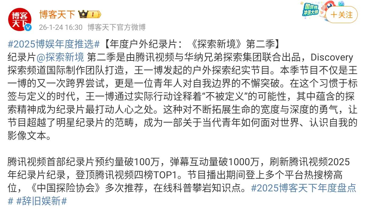 喜报!《探索新境》第二季荣获《博客天下》“2025年度户外纪录片”👏 年末盘点,王一博发起的个人节目《探索新境》要横扫各种榜单了。[赞] 探索新境 不断拓展生命的宽度与深度,成为一部关于当代青年如何面对世界、认识自我的影像文本。