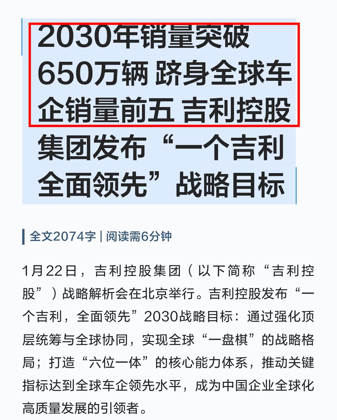 丰田大众比亚迪 谁会被“挤出”全球前五 事情是这样的 吉利公布了2030年销量目标 650万辆的年销量目标 并且跻身全球车企销量前五 2025年全球车企销量Top5分别是 1、丰田 2、大众 3、stellantis集团(标致+雪铁龙+欧宝+沃克斯豪尔+阿尔法·罗密欧+克莱斯勒+道奇+玛莎拉蒂+蓝旗亚+菲亚特) 4、现代起亚 5、比亚迪 你们觉得如果吉利目标实现的话 谁会被挤出前五