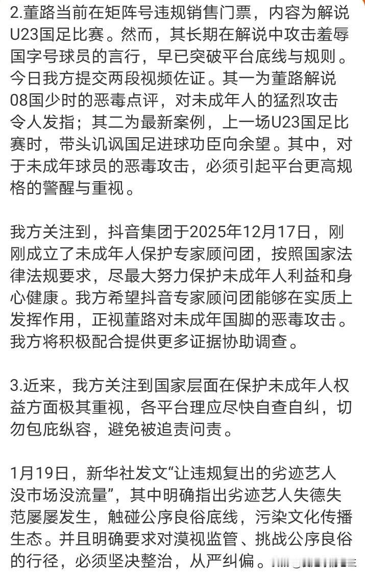前国脚已经不留任何余地了!直接举报平台斩断直播收入! 首先,对于这个前国脚,也许是我孤陋寡闻,我还真不知道他是什么时期的国脚,参加过什么洲际比赛,有过什么样的成绩! 其次,对于他针对于青训对手的攻击,在国内,在国外,没有任何余地的攻击,已经超出了足球本身的行为,与足球无关,与青训无关,这完全就是竞争对手不是你死就是我亡的劲头了,真的没有必要! 最后,关于中国足球小将直播卖票这个事情,我从来没有买过票,但也不耽误我关注和喜欢中国足球小将,我想说的是,卖票这个行为我认为无可厚非,这些踢球的孩子出去见世面,卖票是应该的。你愿意买就可以,没有人逼着你买票! 总之,做人,别那么决绝,无论双方谁,都给自己给对方留点余地! 不要让中国足球青训,混入这些乱七八糟的龌龊之事! 中国足球小将 董路