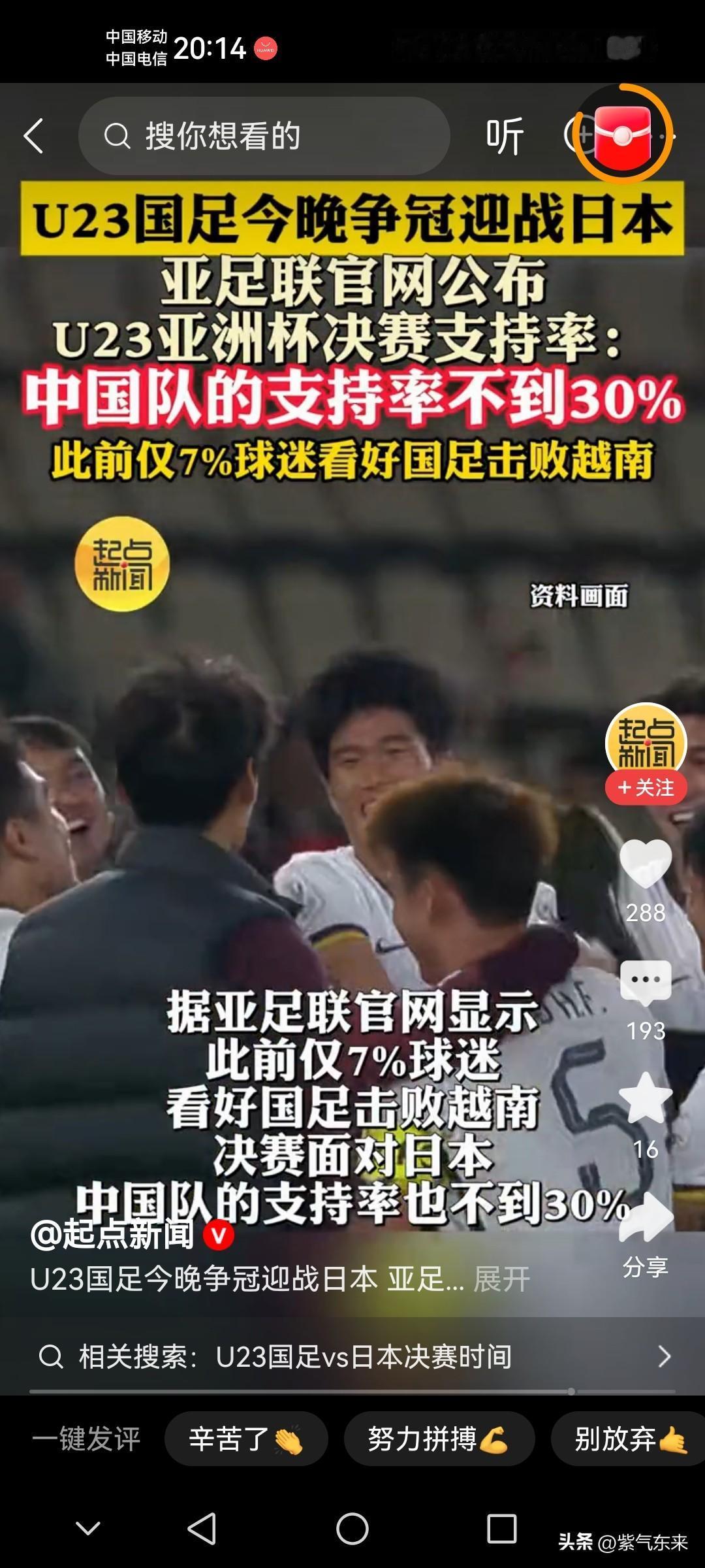 U23亚洲杯决赛,中国VS日本! 亚足联官网公布U23决赛支持率:中国队的支持率不到30%! 这个支持率已经不低了! 个人觉得赢的几率不大,但是球员都是血气方刚的小伙子,一定会打出国威的,都会拼尽全力的! 毕竟对阵的日本,中国人面对日本的时候,一定会奋战到底! 我从来不关注中国足球,足球也是国人心中的痛,每次提到足球都想到了海参、大肚腩等! 这次U23可不一样,说白了就是国家队的储备人才,但是也让国人看到了足球的希望! 希望能创造奇迹!U23男足!U23足球比赛 日本队亚洲杯 U23足球队