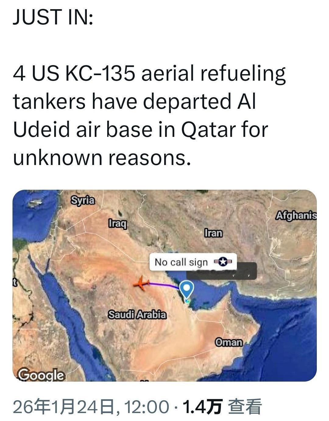 好像马上就要动手了…… -1月24日,英国、荷兰、法国、德国四家航空公司突然同时取消了今晚飞往中东风险地区航班。 -今天四架美国 KC-135空中加油机从卡塔尔的乌代德基地紧急起飞后,飞往中东未知地区。 伊朗方面: 伊朗一部分“沙赫德”导弹已在梅赫拉巴德机场亚什机库地带部署就绪。 刚刚,俄罗斯外交部发言人扎哈罗娃公开提醒所有俄罗斯人“现在不要去伊朗”。