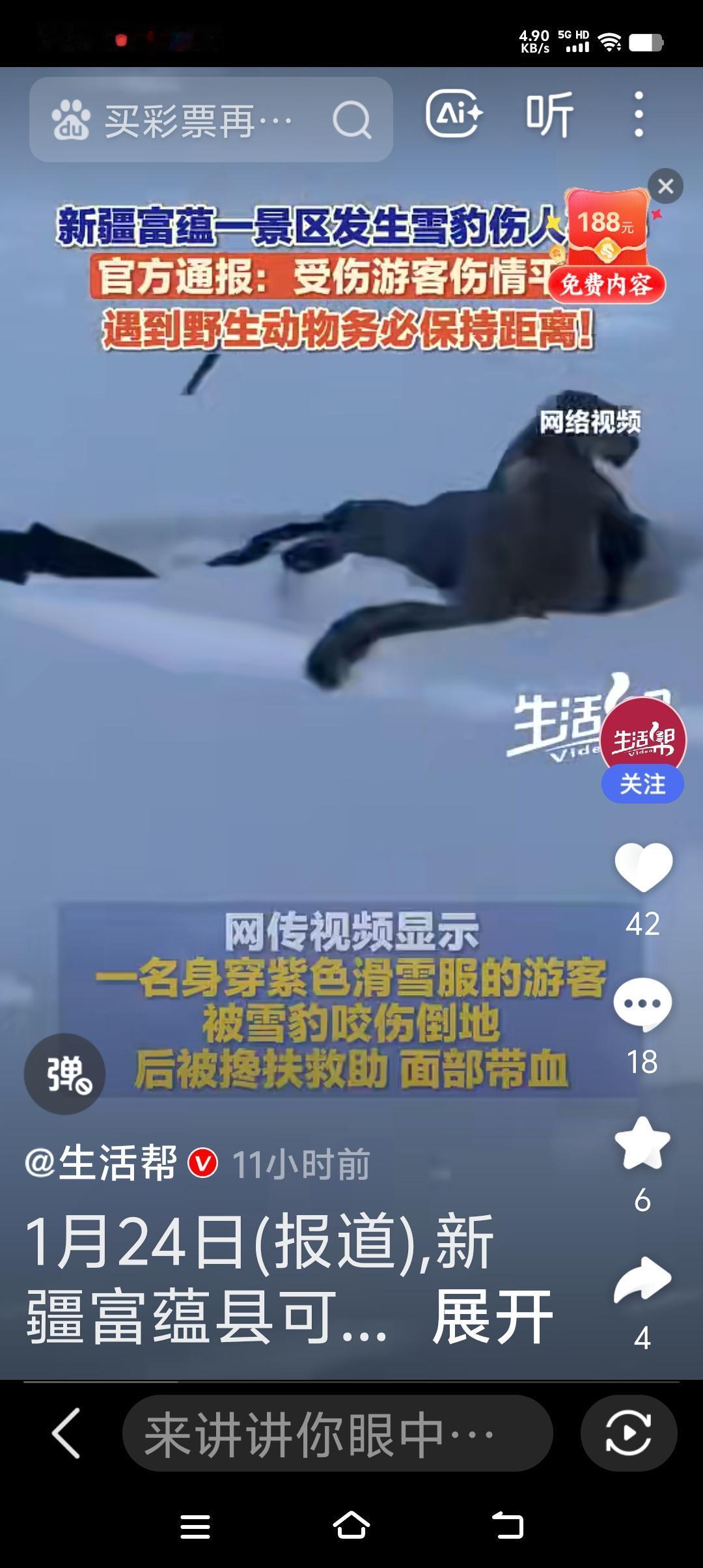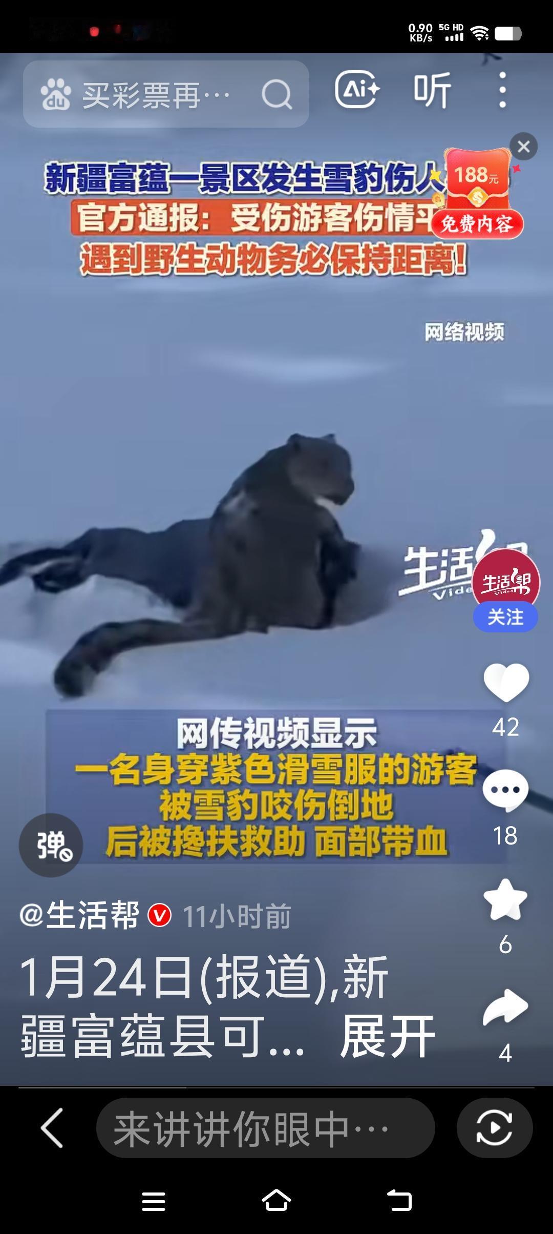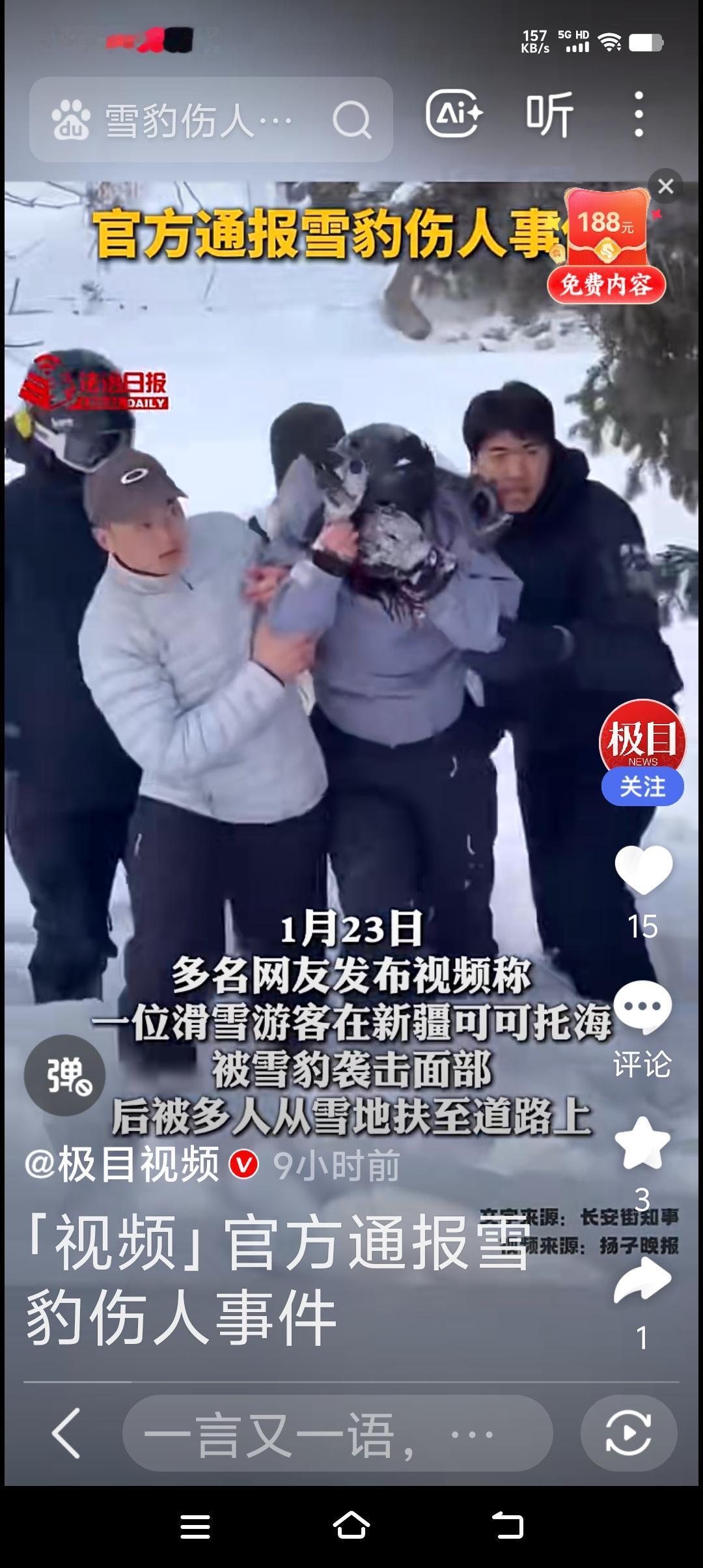 可可托海雪豹伤人又一次证明了,敬畏自然,反之,要吃苦头! 景区预警提醒,不让游客在雪豹出没地段下车,而且警示牌就在那立着,这女士全然不顾,并且在看到雪豹危险时刻,同行者也提醒她不要靠近,可女士却靠近雪豹大约三米处拍照! 这节奏是不是给雪豹送美食啊,冰天雪地雪豹一定饥饿难耐,这一点她真是太大意! 有多少悲剧都是人为的置危险警示与不顾,一意孤行,在自然面前人嘞何其渺小,不要用区区肉身挑战自然中的兽类! 这女士幸好带着头盔,只伤到额头,不然后果不堪设想!