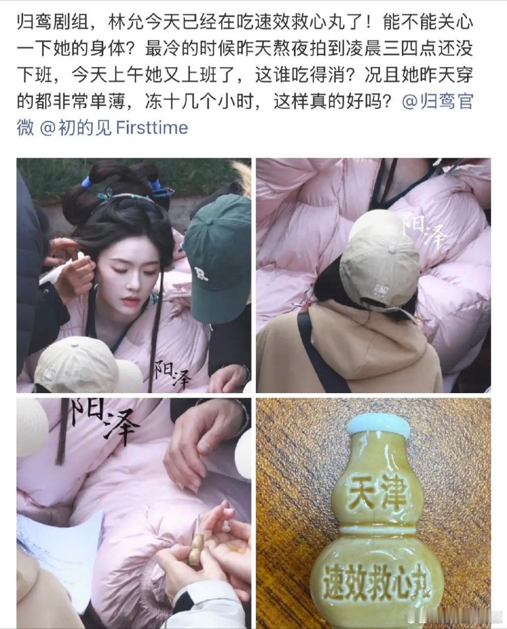 张凌赫 林允《归鸾》剧组怎么回事?林允怎么吃上速效救心丸了?粉丝称最冷的时候昨天熬夜拍到凌晨三四点还没下班,今天上午她又上班了戏服穿的这么单薄,冻十几个小时,这谁受得了?
