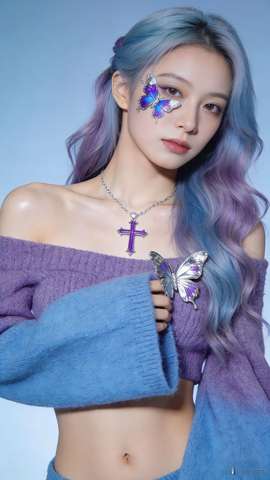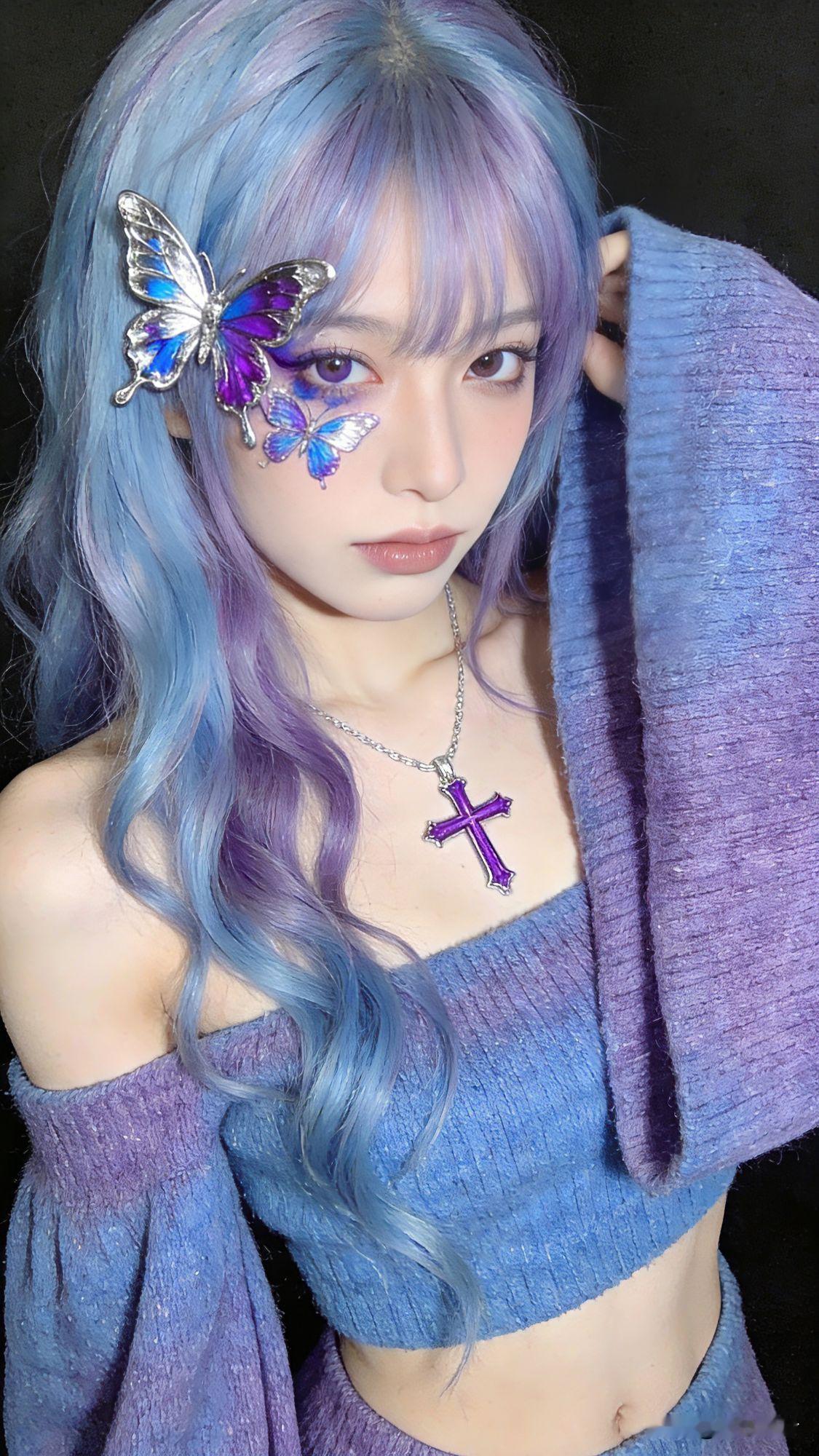 蝶翼栖在眼尾,晕开紫调的梦。 雾蓝与烟紫的发卷,是揉碎的春夜云。 蝶翅沾星子,发梢挽晚风, 谁在眉眼间,种了半亩朦胧。 偶尔也想做不必合群的色彩,像这渐变的发丝,一半是深海的静,一半是晚霞的疯。 蝴蝶发饰轻颤时,才懂小众的浪漫从不需要共鸣——你自盛开,就有光为你而来。 就像此刻,紫色十字架在颈间发亮,我不必成为谁的偏爱,只做自己的特例。风之蝶 蝶羽梦幻照 蝶梦蓝纱 紫雾花蝴蝶 蝶梦粉纱 蝶翼梦幻照 紫蝶氛围感