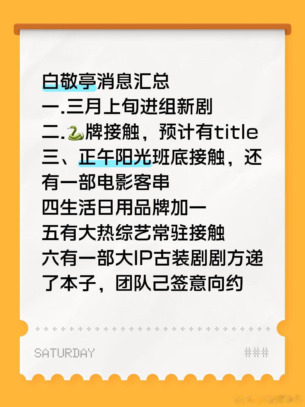 白敬亭消息汇总一.三月上旬进组新剧二.🐍牌接触,预计有titIe三、正午阳光班底接触,还有一部电影客串四生活日用品牌加一五有大热综艺常驻接触六有一部大IP古装剧剧方递了本子,团队己签意向约白敬亭‖白敬亭