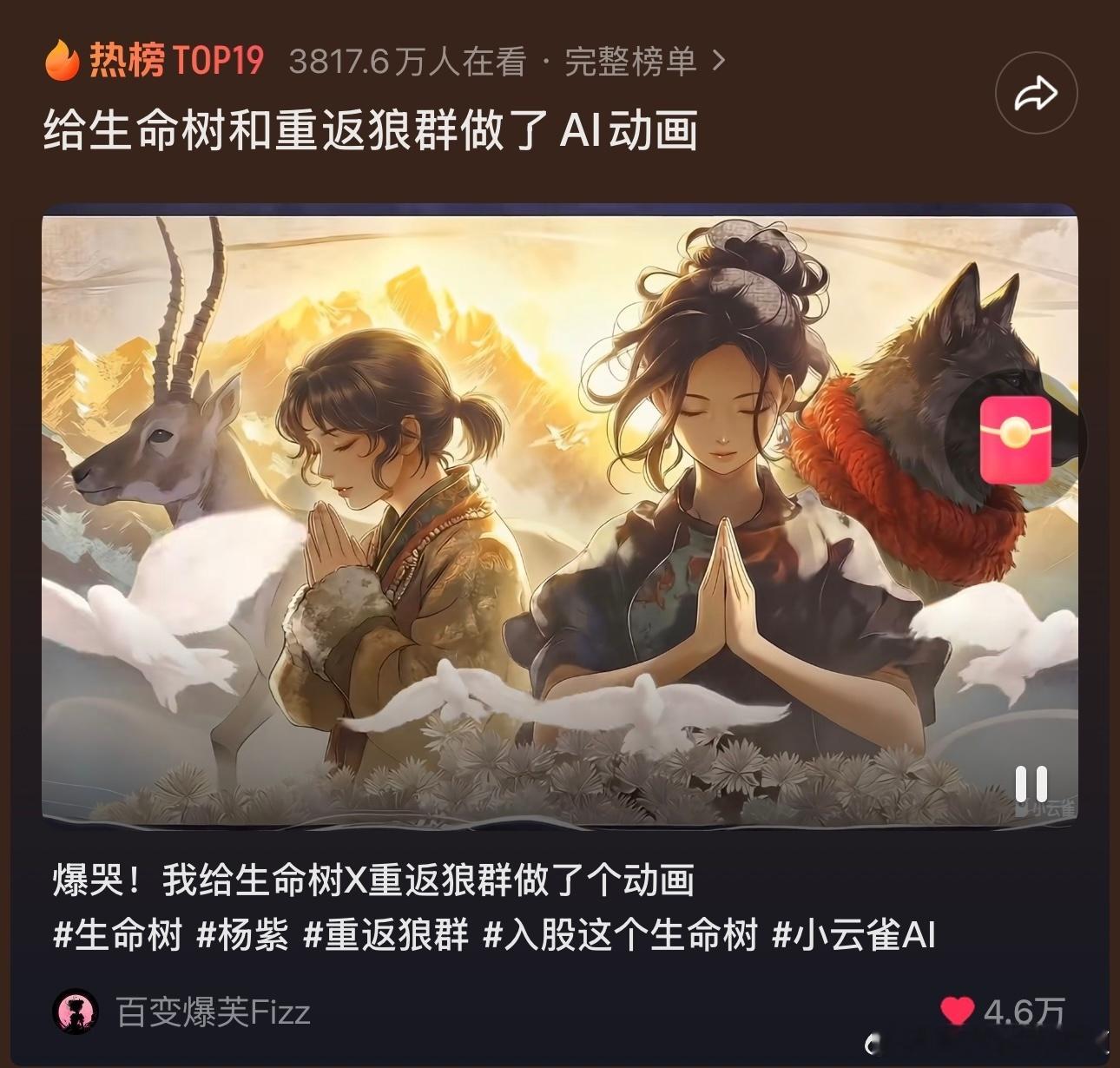 杨紫生命树央八定档网友给生命树和重返狼群做的ai动画上抖热榜了,这波联动很不错,两个主题的关联度很高,如果能够引起民众对生态保护的广泛关注,生命树这部剧就算成功了一大半了。生命树两集连播 生命树官方还没定档,不过基本上已经确定是30号开播,两集连播,年底要热闹起来了。生命树