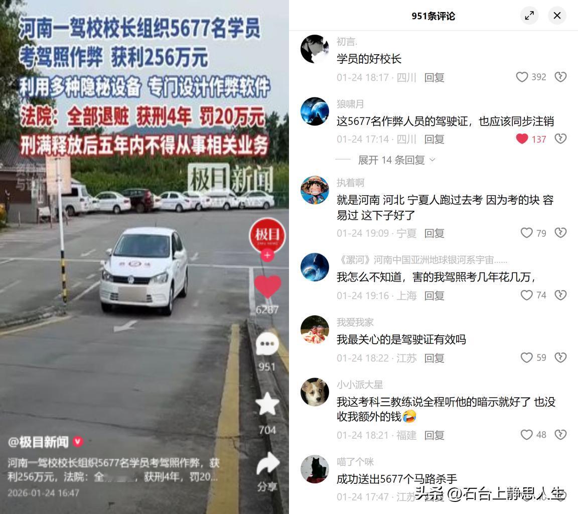 河南一驾校校长组织5677人考驾照作弊,这事儿比送出5677个马路杀手更让人扎心的,是背后那套大家都懂的潜规则链条。 校长用隐秘设备和作弊软件,帮学员跳过练车,赚了256万,最后判了4年多。可现在最让人慌的,其实是那些走捷径的学员,到底有没有拿着驾照上路?毕竟方向盘里藏的不仅仅是钱,更是路上所有人的命。 说到底这不仅仅是一个人的黑心,更是一串各取所需的弯弯绕:有人嫌练车麻烦,愿意花点钱买不用学;有人觉得帮学员作弊是服务到位,能拉来更多生意;还有异地考驾照的空子,让作弊成了跨地区买卖,大家都在传河南陕西驾考有说法,无非就是都知道有些地方松,所以有人专门跑过去找捷径。 最讽刺的是大伙的反应:有人羡慕早说呀我去考,有人感慨我考几年花几万,还有人说教练暗示科三听他的。你看,这事儿早已不再是秘密,变成了有人敢做、有人敢试,大家都赌自己不会出事,赌有关部门查不到。 现在大家问驾照有效吗,倒不如问问:为什么总有人把作弊当成聪明?为什么总有人觉得快速拿证比真会开车重要?为什么有关部门的绳子,没能早一步绑住这些歪心思? 毕竟马路上的安全,靠事后注销补不回来。那些藏在作弊背后的潜规则,才是最该拆的定时炸弹,毕竟你永远不知道,下一个踩错刹车的人,是不是曾经走捷径的那一个。