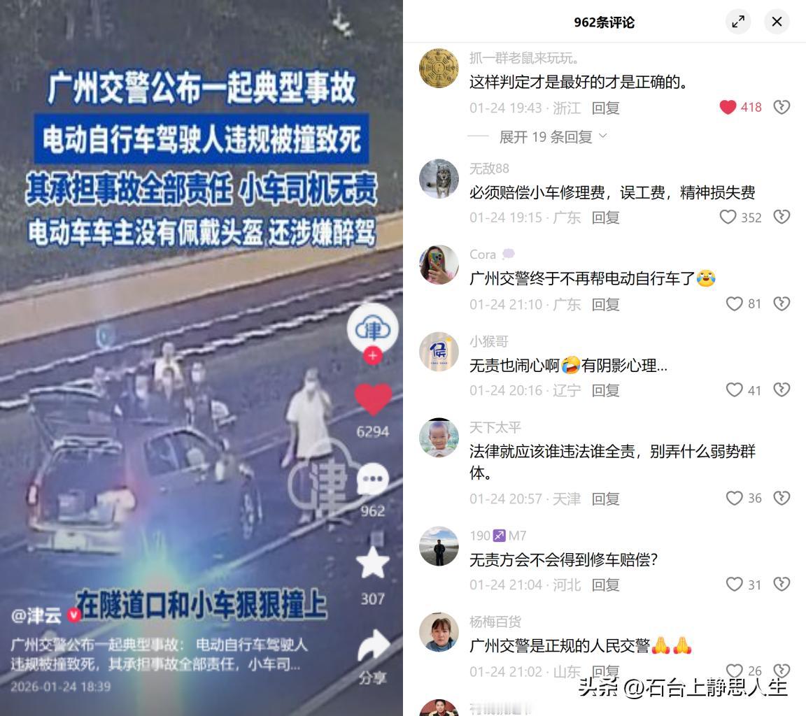 广州一电动车醉驾逆行撞小车致死,帽子叔叔判死者全责,小车司机无责。 1月24号的事,郑某骑电动车在隧道机动车道逆行,没戴头盔还涉嫌醉驾,和正常开的小车迎头撞了,当场去世。帽子叔叔查清楚后,说他全责,小车司机没责任。 这判罚让人舒服,是因为终于没按谁弱谁有理和稀泥,电动自行车不是弱势挡箭牌,醉驾、逆行、不戴头盔,每一条都是拿命赌的错。可舒服归舒服,无责的小车司机才是真闹心:按交法,交强险得赔10%的兜底,车撞坏了要找死者遗产追维修费,就算法律支持,流程也麻烦。更别说心里那道坎,好好开着车,突然撞死人,换谁都得缓好一阵。 这事儿没赢家。郑某为自己的违规付了命,小车司机明明没错,却得为别人的错消化后续麻烦。最该想的是:规则不是冰冷的,可守规则的人,不该为不守规则的人承担额外代价。