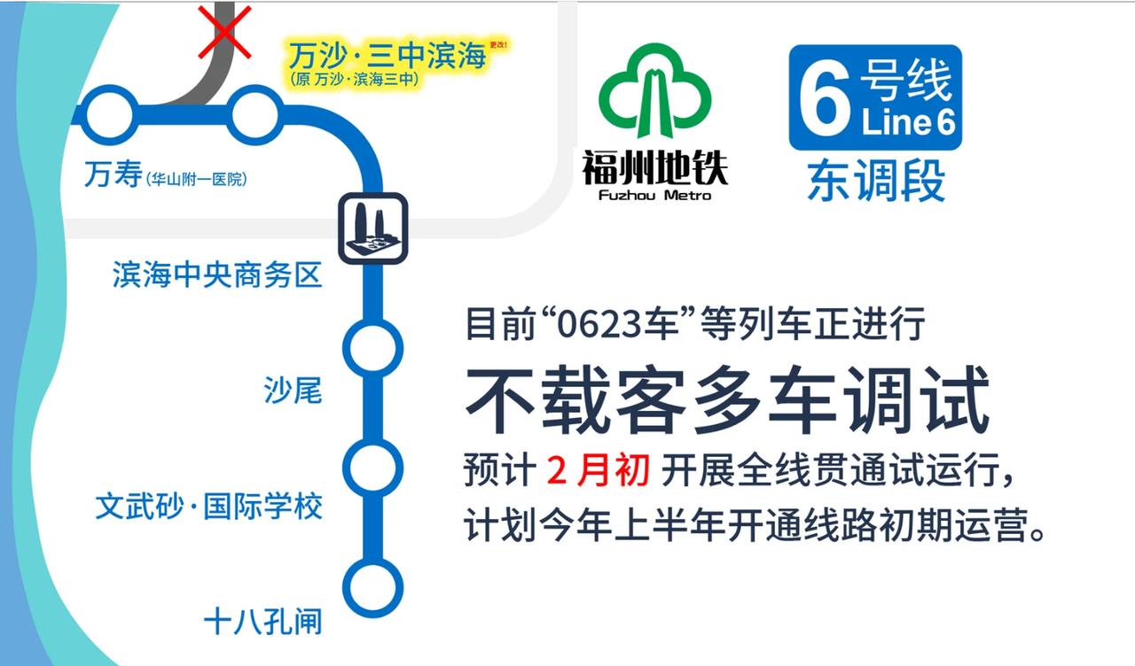 预计2月初开始试运行!福州地铁6号线东调段新进展! 福州地铁6号线东调段于12月20日结束“天窗期”施工,近期正开展万寿站至十八孔闸站不载客多车调试,“0609车”“0617车”及新车“0623车”等参与调试,预计2月初将开展全线贯通空载试运行“跑图”的第一阶段,计划今年上半年开通线路初期运营。