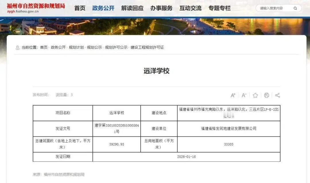63个班,3150个学位!福建师大附属晋安实验学校落户三远片区!项目已于1月16日成功取得建设工程规划许可证,拟于2027年秋季招生前全面竣工并投入使用。