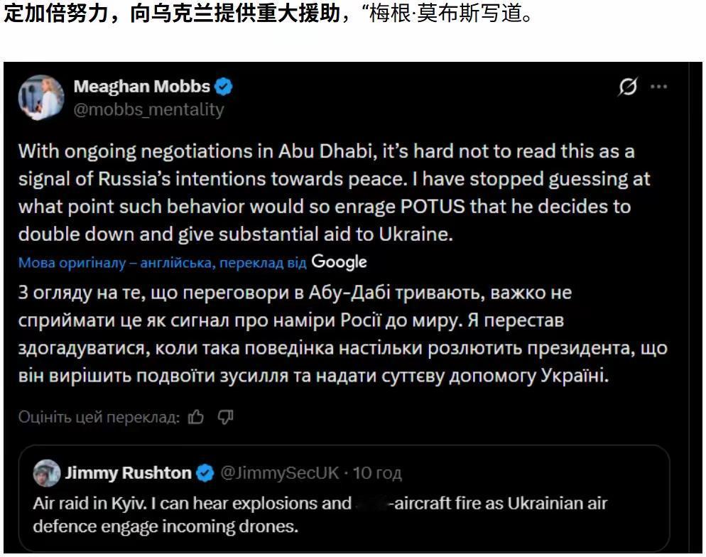 完整翻译 梅根·莫布斯(Meaghan Mobbs)推文: 鉴于阿布扎比的谈判仍在进行,很难不将此视为俄罗斯传递的和平意图信号。我已经不再猜测,这种行为要到什么程度才会彻底激怒美国总统,让他决定加倍努力,向乌克兰提供大规模援助。 吉米·拉什顿(Jimmy Rushton)推文: 基辅遭遇空袭。我能听到爆炸声和高射炮的轰鸣,乌克兰防空部队正在拦截来袭的无人机。