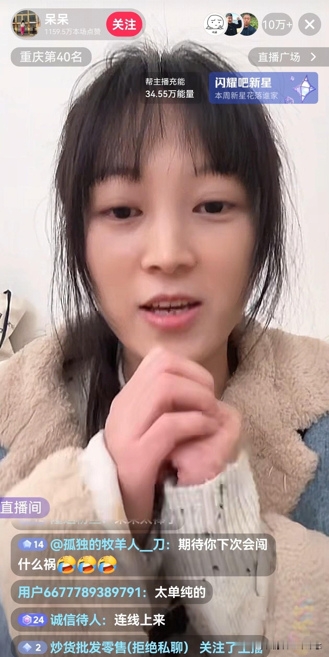 呆呆直播两个半小时, 直播间人数一直维持在10万+ 她澄清了三件事—— 第一,她其实不是23岁,而是91年的,今年35岁,而且未婚。 第二,她没有入编合川文旅,她有自己的事情在做。 第三,她没有团队,都是她一个人。 整个直播过程她给人的感觉就是很“呆”,而且过于紧张,多次说大家打字太快,自己看不过来,也不会开打赏功能。 直播中断了几次,每次回来都还能有10+的人在。公屏上大多数网友还是喜欢呆呆的,给她出主意,提醒她注意事项,告诉她怎么开打赏,鼓励她支持她。 但是也有一些凑热闹的,听说人家的年龄,没结婚,就说这颠三倒四的话,很不礼貌。 流量是把双刃剑,带来的不仅有善意和关注,也会有恶意与纷扰。希望呆呆能保护好自己,不必被流量裹挟着往前走,只要她还是那个真诚、朴实的自己,就一定能留住那些真正喜欢她的人。