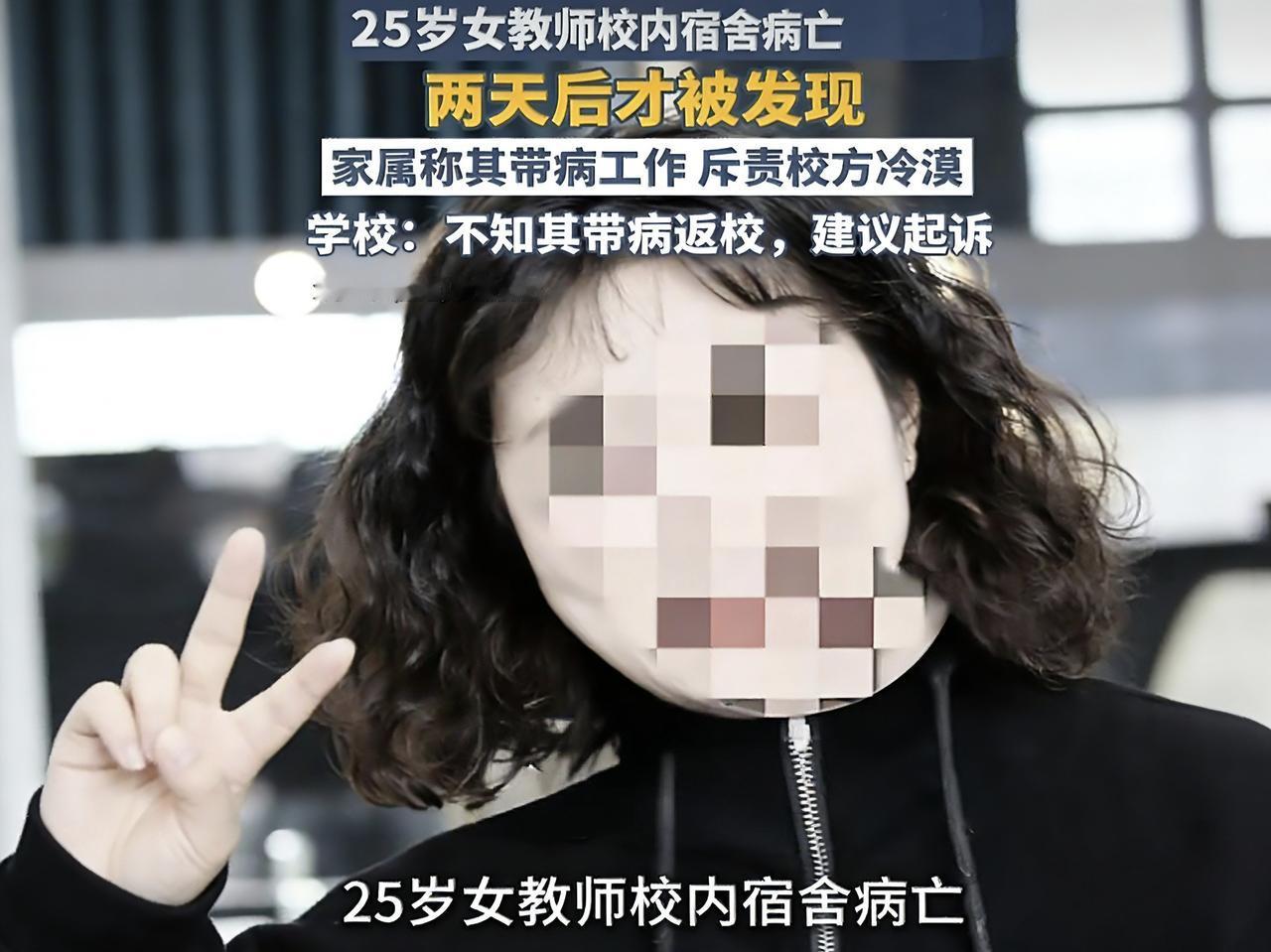 25岁女教师在宿舍病亡2天后才被发现!带病返岗的悲剧该谁负责? 安徽合肥一所技工学校里,25岁的女教师黄小如在自己的宿舍里离世,两天后才被学生发现。 元旦前,她高烧39℃还在带学生排练节目,12月31日请病假被拒,校长让她“坚持开会”。元旦假期确诊呼吸道感染和应激性胃炎,刚好转一点,1月6日就被学校以“迎检”为由要求中断病假返校。 1月7日、8日是工作日,她没去上班,学校却没安排人去宿舍看看。直到1月10日晚上,学生找她时才发现人已经没了,法医判定她在8日晚就因呼吸心跳骤停去世。 家属痛批学校冷漠:人都返校了,两天没上班,为什么没人查岗?如果早一点发现送医,或许悲剧就不会发生。但校方回应说“不知道她带病返校”,还建议家属“起诉解决”。 这件事戳中了无数打工人的痛点。“带病上班”成了很多人的无奈日常,可当悲剧发生,最该负责的管理漏洞却被轻描淡写。教职工宿舍连基本的巡查、应急联络机制都没有,独居的老师出事48小时都没人察觉,这样的安全保障,让人心寒。 一条年轻的生命,倒在了“带病文化”和管理失职的双重重压下。我们期待一个公道,更希望这样的悲剧不再重演。安徽女去世 工作意外死亡 教师 老师 工作