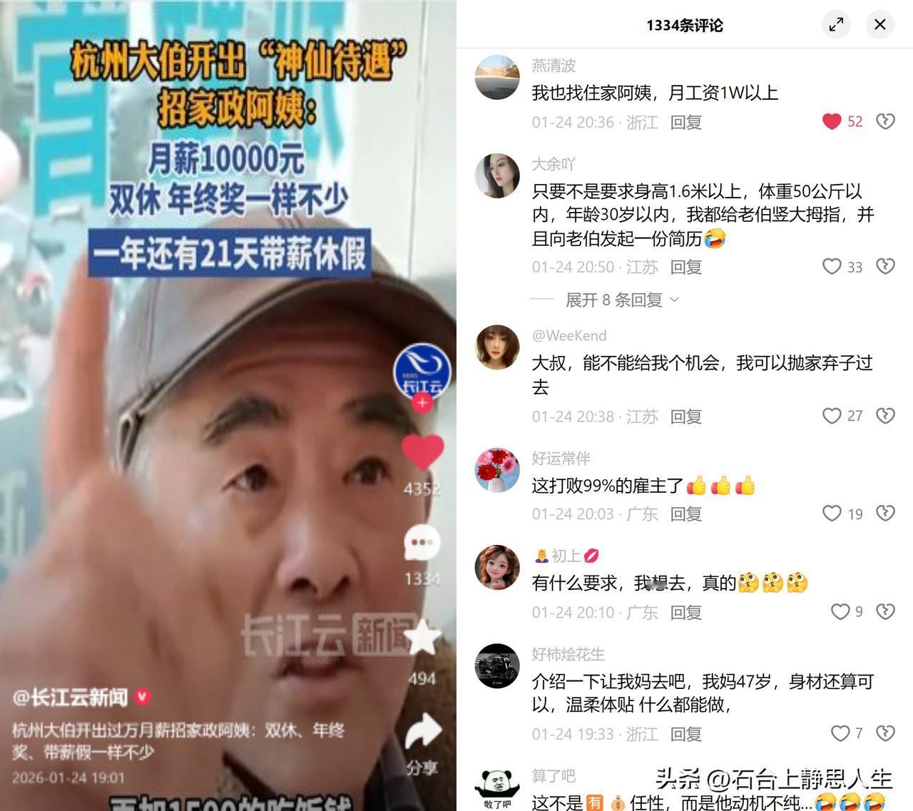 杭州有位大伯招家政阿姨,开出的条件让不少打工人都酸了。 主要是照顾家里老人,给月薪一万,还有双休和21天带薪年假,这和杭州住家保姆普遍月休4天的行规,简直是两回事。 要知道,杭州住家保姆的潜规则是住家=全天候在岗,月休4天算常规操作,说直白点就是每天都得盯着,休息权早被行业惯例磨没了。大伯这不光是有钱任性,更是真把保姆当要过日子的人看,与其说是招个24小时待命的工具,不如说是找个能有自己生活的照顾者。 你看大家都在讨论,有人晒营养师高级证、面点师证求机会,有人说不想再做白眼狼家的工具,大家馋的哪里是那一万块?真正打动人的是有人把人放在雇佣关系的第一位,承认阿姨也需要周末陪家人,需要年假喘口气。 这年头,很多关系里利字当先,能想起人的需求,才是最金贵的。 毕竟,谁愿意一辈子做没有休息的工具呢?