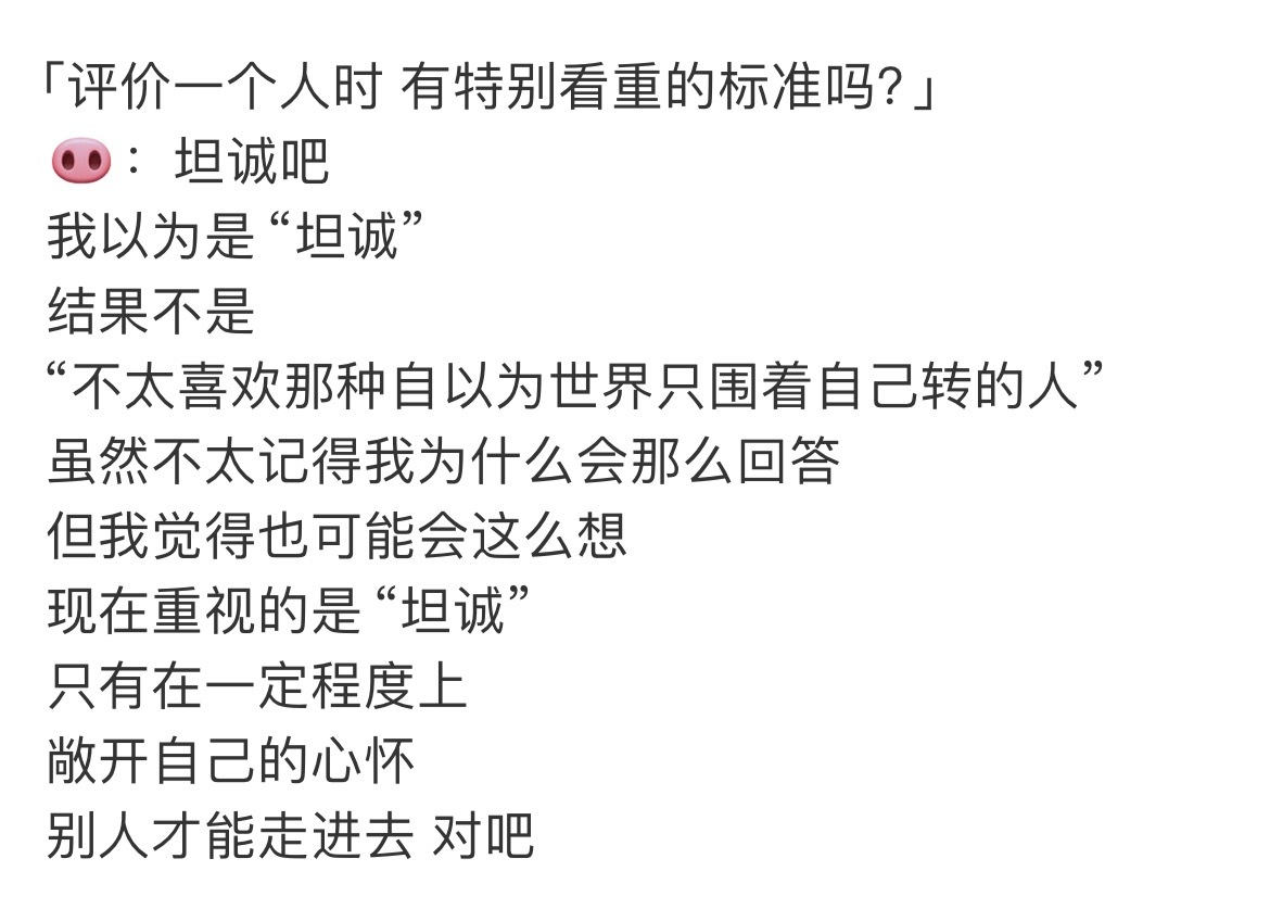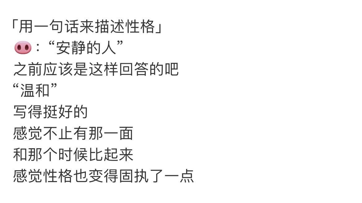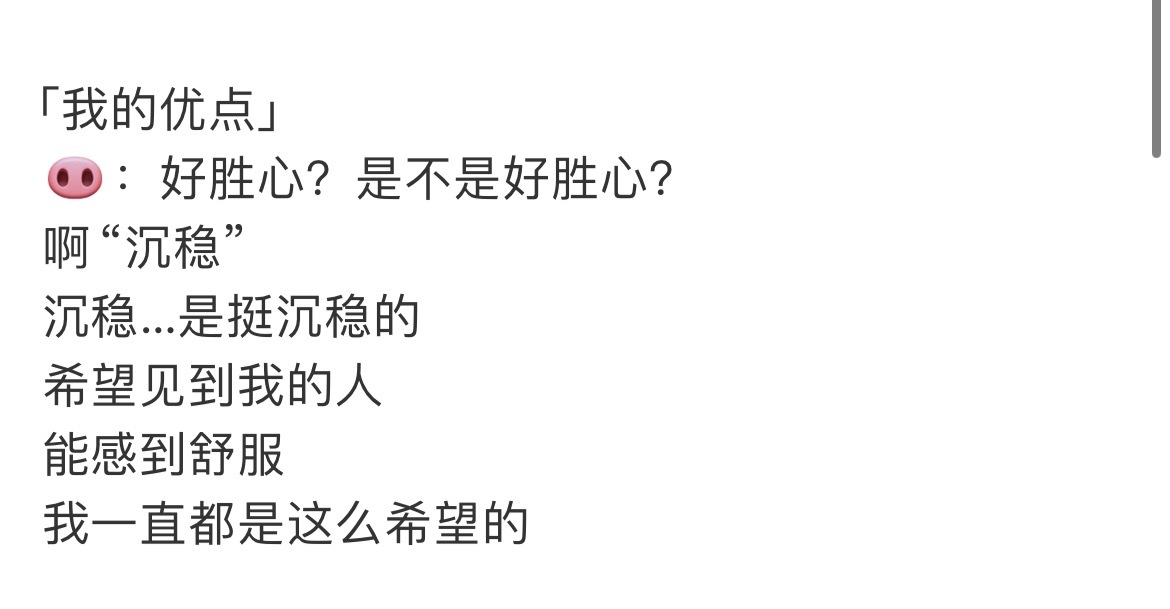 -家猪是一个外表沉稳,内心有自己的节奏和温度的小宝宝看重坦诚“人得先打开自己,别人才进得来”,总是有着不符合自己年龄的通透。性格,说自己从安静温和变得有点固执,不美化过去,不遮掩现在,坦然接受每一个时期的自己,能自省,却不内耗。优点,从好胜心和沉稳中选择了后者,理由只是“希望见到我的人能感到舒服”。在人人都想突出自己的环境里,你却最终选择了为他人着想。总是在希望金主训的身边也能出现一个金主训金主训