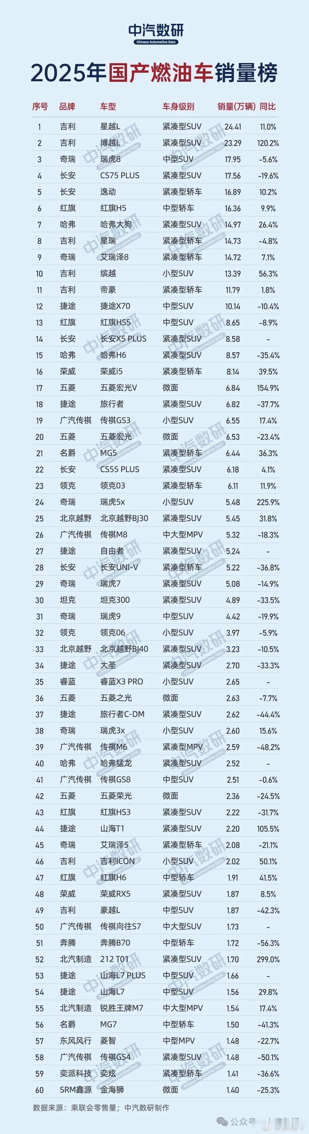 中汽数研统计的2025燃油车销量榜,分合资篇和国产篇。单看这份榜单都给我看出回忆杀了,尤其是合资,多少年过去了,这些车居然都还在。大v聊车
