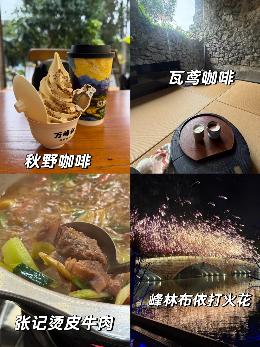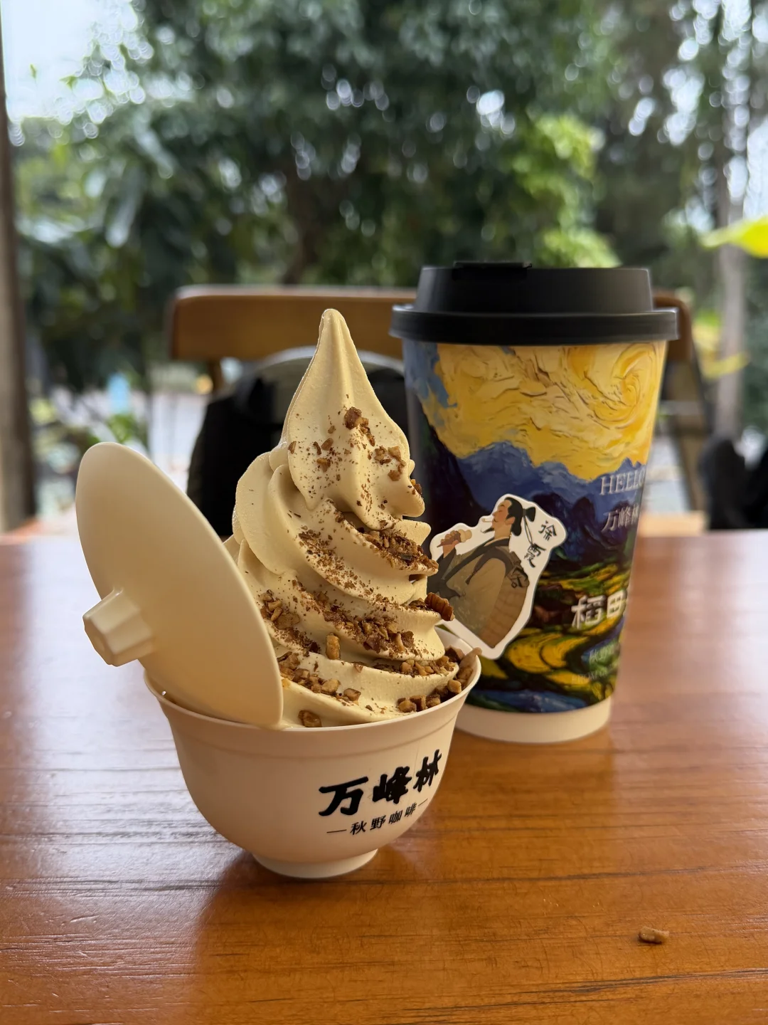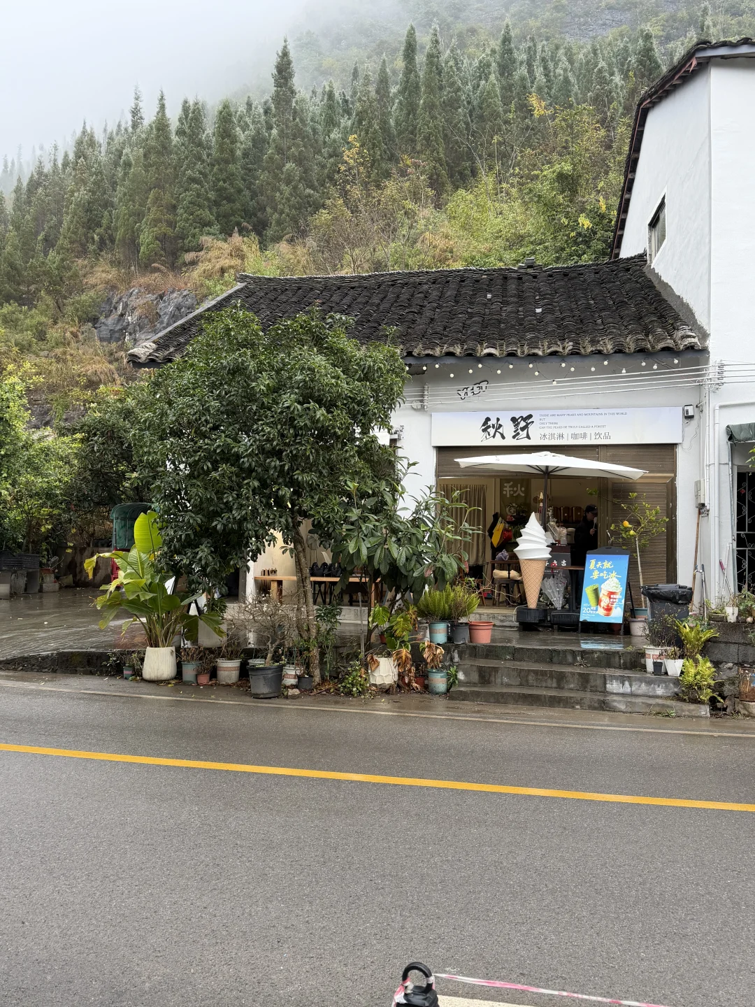 我们租了一辆带棚的电动车,正好坐下三个人,开始万峰林的环游~从我们所在的上纳灰村出发,先打卡了离酒店不远的,里面有一只巨乖巧的柴犬,外面下着雨,店里的音乐舒缓,非常适合避雨歇脚。点了招牌冰淇淋和拿铁~嗯~只适合拍照打卡~