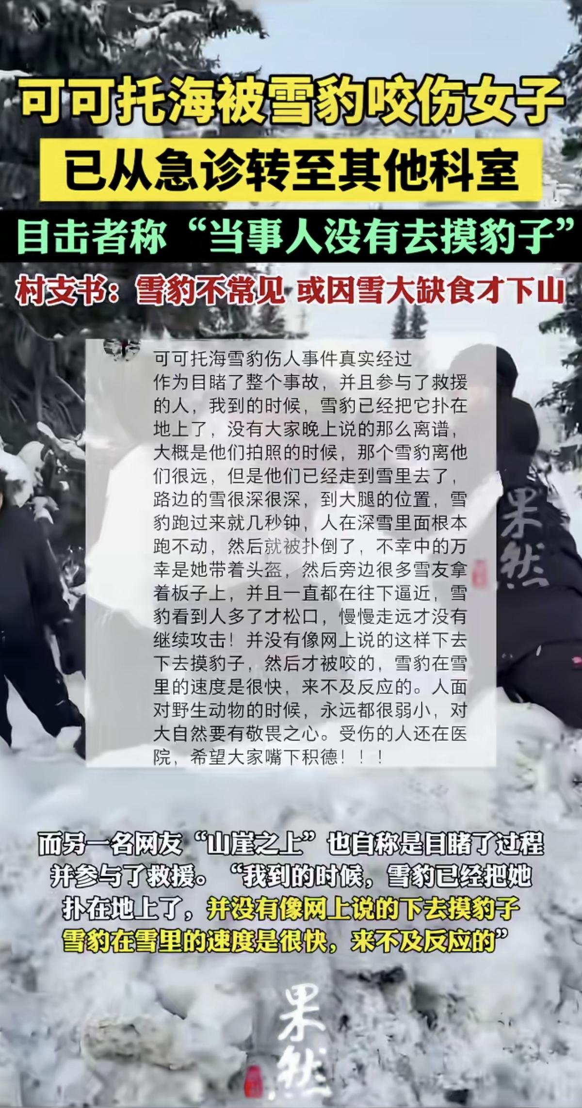 刚从急诊转出来,这位被雪豹咬伤的女游客就发文澄清,觉得自己是无辜的,不该被网友们指责。为什么同行的游客没有被雪豹咬伤而偏偏是她呢? 雪豹是野生动物,领地意识很强,是天生的捕猎能手,可不是可爱的“大猫咪”。 既然到可可托海旅游,她不会不知道当地有雪豹吧! 她发文强调说,自己去雪地里拍照,不是因为看到了雪豹,更没有摸雪豹,旁边的提示牌也没说附近有雪豹。 不管怎么说,作为一个成年的游客,她还是要为自己的行为负责的。 为什么同行的其它游客没有去拍照? 从急诊出来,伤情平稳,这是好事。 她出来发文难道不应该感谢当时救助她的人吗? 而她更在意的却是自己被一些网友指责。 我觉得她还是没有认识到问题出在了哪里。 事情已经发生了,事后就应该认真反思,为什么会发生这样的事,以后怎么避免类似的事再发生,但该女子说这些的意义是什么呢? 难道是雪豹的错? 就算是雪豹的错,和它说,它也听不懂,没法改正啊! 俗话说,吃一堑长一智。 她已经被雪豹咬伤了,应该多反省自己有什么错吧!