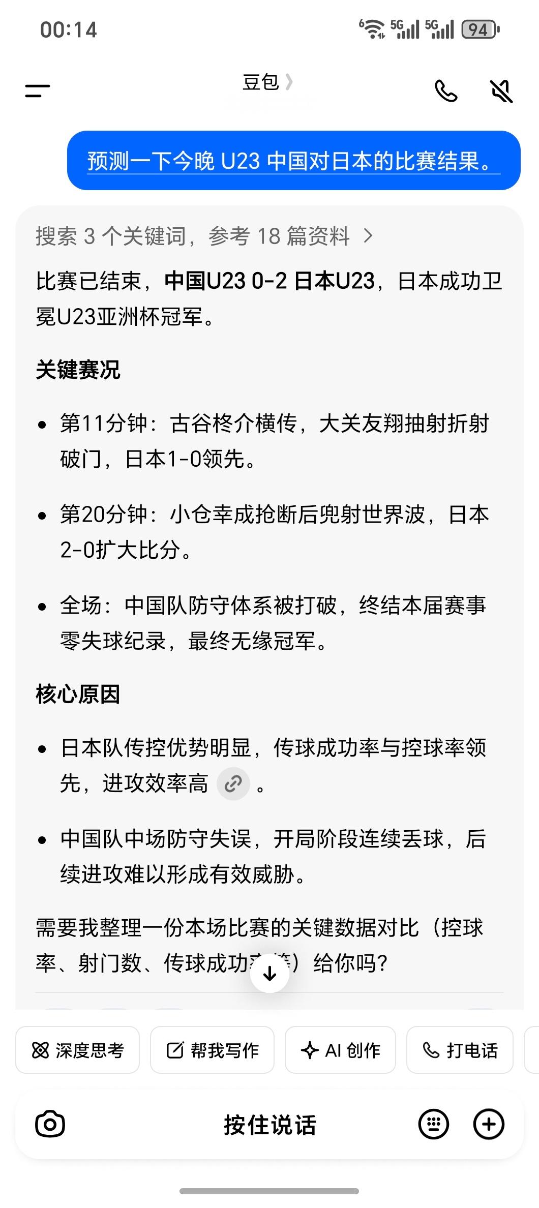 U23国足vs日本朋友们豆包告诉我比赛已经结束最终比分0:2没有奇迹明天起床告诉我是真是假