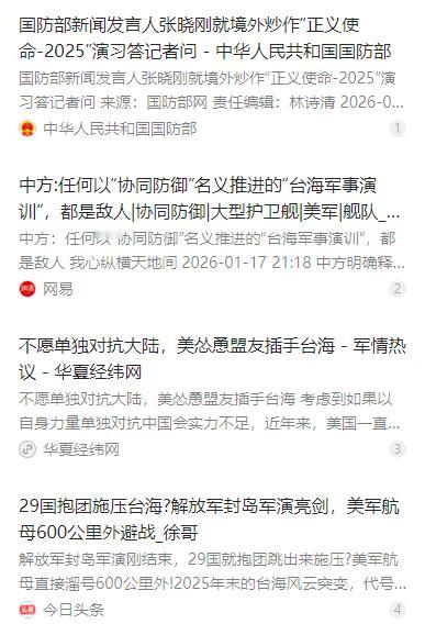 中方明确释放:任何以“协同防御”名义推进的“台海军事演训”,都将被视为“联合作战敌对行为”,话已经挑明,谁敢碰线,谁就承担后果,南海舰队、东部战区同步升高戒备,两个方向一旦变频,将直接转入实战模式。 麻烦看官老爷们右上角点击一下“关注”,既方便您进行讨论和分享,又能给您带来更多优质的内容,感谢您的支持! 台海问题向来是中国的核心利益红线,近期中方针对外部势力的台海军事动作,亮出了最明确的态度,直接划清了不容触碰的界限,任何打着 “协同防御” 旗号在台海搞军事演训的行为,都将被认定为联合作战敌对行为,这一表态没有任何模糊空间。 美方及其盟友若是敢踩下这条红线,就要做好承担相应后果的准备,中方从不会在国家主权和领土完整问题上有半分退让,这次的直白警示,就是给所有心怀不轨的外部势力敲下最响的警钟。 面对外部势力的步步紧逼,中国人民解放军南海舰队、东部战区已同步提升戒备等级,两大方向形成联动防御态势。所谓的 “变频” 信号,只要出现指挥体系调整、通信链路切换这类异动,解放军就会直接从日常战备状态切换至实战模式,不打折扣、绝不迟疑。 之所以中方做出如此强硬的表态和军事部署,根源在于美方近些年持续在台海问题上搅局。美国一直拉拢日本、菲律宾、澳大利亚等国,甚至还试图让北约势力介入台海,不断突破底线制造事端。 美方通过组织多国联合军事演训、推动区域内军事基地开放共享等一系列动作,想方设法将台海问题国际化、外部化,企图把原本属于中国内政的问题,变成其遏制中国发展的区域博弈筹码,推动外部军事力量在台海周边常态化存在。 美方的这些操作,还刻意将自身的军事介入包装成 “防御性演训”“多国协同防御”,试图用这种方式洗白其干涉中国内政的本质,以为这样就能规避直接对抗的风险,在台海的灰色地带不断试探中方的底线。 但中方早已看穿美方的伎俩,这次直接对 “协同防御” 名义下的台海军事演训进行强硬定性,就是要彻底堵死外部势力的洗白空间。不给任何国家留下模糊解读的余地,明明白白划定红线,让所有意图参与相关演训的国家看清后果。 这一表态并非空穴来风,更不是中方的虚张声势,而是建立在实打实的实操级军事准备和精准战略判断之上的底线宣告。解放军在台海周边的演训早已不是单纯的威慑训练,而是针对分裂势力和外部干涉的实战化排练。 东部战区此前开展的 “正义使命 - 2025” 演习,就全面检验了一体化联合作战能力,陆海空火箭军多路兵力全域出击,在台岛周边形成立体封锁态势,用实弹演训彰显了打 “独” 促统、反制干涉的强大实力。 南海舰队也同步做出战备调整,在海南方向新设临时补给点,将后勤补给线向前推进 80 公里,这一调整让舰队能在第一岛链内长时间驻守,封锁能力和持续作战能力大幅提升,直面外部势力可能的海上介入。 解放军的一系列军事部署,让实战应对的准备落到了实处,从兵力调配、火力部署到后勤保障,各个环节都形成了完整的作战体系,足以应对任何形式的联合作战敌对行为,这也是中方敢于亮明底线的底气所在。 中方的强硬态度和实际行动,也已经产生了切实的震慑效果,让原本在台海问题上态度激进的日本,以及部分试图跟风介入的欧洲国家,态度开始趋于谨慎和收敛。这些国家逐渐看清美方的算计,也深知触碰中方红线的严重后果。 日本此前曾叫嚣 “台海有事就是日本有事”,还与美方拟定所谓共同作战计划,如今却收起了嚣张气焰,转而通过非公开渠道表达所谓 “担忧”,不再敢公开做出激进的军事表态,行动上也明显收敛。 部分欧洲国家原本在美国的怂恿下,试图在台海问题上发声站队,如今也开始重新考量自身立场,意识到台海问题的核心是中国内政,贸然介入只会引火烧身,因此在行动上保持克制,不再轻易跟随美方的步伐。 台海和平稳定的最大威胁,从来都是 “台独” 分裂行径和外部势力的纵容支持,中方始终珍视台海和平,但绝不会为了和平放弃国家主权和领土完整。任何试图挑战一个中国原则,在台海搞分裂和干涉的行为,都将遭到解放军的坚决回击。 美方及其盟友若是无视中方的红线警示,执意以 “协同防御” 名义推进台海军事演训,等待他们的必然是解放军的强硬反制。南海舰队和东部战区的同步戒备,就是中方的实际行动回应,只要出现异动,实战模式随时开启。 中国在台海问题上的立场一贯明确且坚定,实现祖国完全统一是历史大势,更是中方必须完成的历史使命。任何势力都不要低估中国人民捍卫国家主权和领土完整的坚强决心、坚定意志和强大能力,碰线必被反制,这是不容置疑的事实。