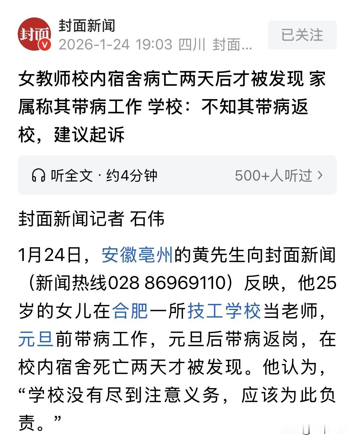 安徽亳州,25岁女老师工作期间发烧,但还是坚持带学生排练,完成元旦表演,结束后,她烧得更严重了,就想请假半天,却被告知下午要开会,再坚持一下,然而这一拖,她病情加重,实在没辙,她请了2天假,返校那天,她进了宿舍再也没能出来,死亡2天后才被人发现。她父亲悲痛不已,认为校方没有尽到注意义务,校方却表示不知道女子带病返校了,让家属起诉。 老黄怎么也没想到,自己捧在手心里的闺女,就在离家不过三四个小时车程的学校里,孤零零地走了。 25岁的小如,是个争气的孩子。 2024年刚从学校毕业,转头就应聘回了母校当老师,还当上了班主任。 在老家人眼里,这就是“吃上皇粮”了,体面又稳定。 可谁知道,这看似光鲜的背后,是要命的透支。 事情得从去年年底说起。元旦前夕,学校要搞汇演,小如作为班主任,自然成了大忙人。 按照学校规矩,她得利用晚自习或者休息时间,带着一帮学生排练。 那时候天冷,流感又凶,小如很快就中招了,发烧、浑身疼。 但她想着不能掉链子,硬是咬牙挺着。 12月30日,演出总算结束了,小如的病却没结束,反而更重了。 第二天,也就是12月31日,她实在烧得受不了,人都有点恍惚了,才去找副校长请假。 结果呢?副校长的一句话把她堵了回来:下午要开会,坚持一下。 这一坚持,小如就把最佳治疗时间给错过了。开完会学校放了假,小如没力气回老家,就喊在合肥打工的弟弟来接。 在弟弟出租屋的那几天,她是在诊所和医院度过的。 门诊病历上写着:发热1天,呕吐,体温直奔39℃。后来转到另一家医院,确诊是呼吸道感染加应激性胃炎。 这时候的小如,身体已经在报警了,可心里还惦记着工作。 学校原定1月4日上课,她请了假,一直请到6号。为啥是6号?因为学校通知6号上午有迎检,这可是大事,作为班主任她不能缺席。 6号上午,小如拖着病体回了学校。 她住的是校内单人宿舍,对门虽然有同事,但大家各自忙乱,谁也没想到这个平时开朗独立的姑娘已经病入膏肓。 回宿舍后,她几乎没再迈出房门一步。 7号中午,有老师给她捎了饭。下午,有学生去帮她打扫卫生。这也是小如留给世人的最后痕迹。 之后的两天,1月8号、9号,是工作日,小如没去办公室。 但在这个人员分散的学校里,一个老师没出现,竟然没人觉得不对劲。 直到1月10号晚上8点多,学生去宿舍找她,门推开,才发现小如人已经凉了。 法医的结论像一把刀插在父亲老黄心上:呼吸心跳停止,死亡时间大概在48小时前,也就是8号晚上。 老黄崩溃了,7号、8号都是工作日啊!孩子就在学校宿舍里,如果学校哪怕有一个人去敲敲门,哪怕打个电话问问,把她送去医院,这条命是不是就能救回来? 更让老黄心寒的是学校的态度。 校方给出的书面材料里写到:小如请假到9号,10号是周六不用请假,学校未知其已返校,属于疾病死亡,跟学校没关系。 负责人面对采访时表示:她6号回来了,但没到岗,也没参加迎检。学校人多办公室散,我们不知道她回来了。后来出事了看监控,才晓得她进了校门。 负责人还说:她在弟弟那边看病,家属肯定知道她病了啊。要是觉得学校有责任,那就走法律程序吧, 这话听得人火大。一个刚毕业的年轻姑娘,为了学校的演出累倒,带病坚持开会,为了迎检带病返校,最后死在学校宿舍里。学校一句“不知道”、“没到岗”,就想把自己摘得干干净净? 老黄现在后悔得肠子都青了。女儿性格太独立,离家远,报喜不报忧,怕家里人担心,生病了也是一个人扛。 他总以为学校是个安全的地方,有老师有领导,谁能想到会发生这样的事? 现在,人已经走了,但这事儿,不能就这么稀里糊涂地算完,正如家属说的,得有个说法,得让人知道,劳动者的命,不是草芥。 那么,从法律角度怎么看待小如的死? 《工伤保险条例》第15条第1款第1项:职工在工作时间和工作岗位,突发疾病死亡或者在48小时之内经抢救无效死亡的,视同工伤。 这个案件的核心在于小如的死亡是否构成视同工伤。 法医鉴定其死亡时间约为1月8号晚,距其最后一次在岗不足48小时。 虽死亡发生在宿舍,但校内宿舍可视为工作岗位的延伸。 关键在于,学校在小如发病期间没有履行必要的救助义务。 小如带病坚持工作、返校迎检,学校却以未到岗为由推卸责任,这种不作为与死亡结果存在因果关系。 如果能证明发病时处于工作状态,且学校未及时送医救治,完全符合“在工作岗位突发疾病48小时内死亡”的构成要件,学校应承担工伤赔偿责任,而非仅以疾病死亡推脱。 对此,你怎么看? 欢迎关注@一案一论