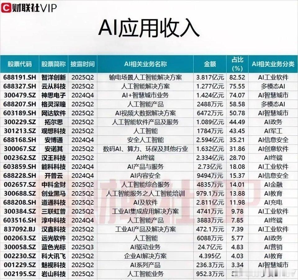 AI应用龙头|AI业务收入占比TOP榜,ToB赛道成商业化落地核心本次梳理聚焦A股AI应用龙头企业的AI相关业务收入及营收占比,覆盖AI工业软件、多模态AI、AI智慧城市、AI金融等12大细分赛道。整体来看,各公司AI业务的收入规模与营收占比分化显著,ToB领域为核心布局方向,企业端AI渗透节奏远快于ToC端,头部标的已在细分场景实现AI业务规模化落地,展现出较强的商业化能力。核心AI应用标的全梳理(按营收占比从高到低)1. 智洋创新【AI工业软件】:AI输电场景解决方案收入3.817亿元,营收占比82.52%;AI业务为核心收入来源,深度绑定电力工业细分场景2. 云从科技【多模态AI】:人工智能解决方案收入1.277亿元,营收占比75.55%;依托多模态技术优势,AI方案在多场景商业化落地3. 神思电子【AI智慧城市】:AI+智慧城市业务收入1.424亿元,营收占比74.07%;深耕城市智慧场景,AI业务贡献超七成营收4. 格灵深瞳【多模态AI】:人工智能产品收入2488万元,营收占比58.58%;聚焦计算机视觉技术,AI产品收入占比超五成5. 网达软件【AI智慧城市】:AI视频大数据解决方案收入6472万元,营收占比50.78%;专注视频大数据AI应用,相关业务占比过半6. 拓尔思【AI政务】:人工智能软件产品及服务收入1.089亿元,营收占比44.49%;为政务场景提供AI软件服务,业务占比接近五成7. 观想科技【AI军工】:人工智能业务收入1784万元,营收占比43.45%;布局军工场景AI应用,相关业务占比超四成8. 安博通【AI信息安全】:安全人工智能收入2.594亿元,营收占比35.21%;聚焦AI驱动的网络安全防护,业务占比超三成9. 安诺其【AI创意软件】:数码AI/算力等相关收入1.632亿元,营收占比31.86%;跨领域拓展AI应用,业务占比超三成10. 汉王科技【AI终端】:AI终端收入2.334亿元,营收占比28.70%;以AI终端产品为核心,相关业务占比接近三成11. 能科科技【AI工业软件】:AI产品与服务收入2.73亿元,营收占比18.08%;为工业场景提供AI产品及服务,业务占比超18%12. 开普云【AI信息安全】:AI内容安全收入9494万元,营收占比15.37%;专注AI内容安全防护,业务占比超15%13. 中科金财【AI金融】:人工智能综合服务收入4835万元,营收占比14.01%;布局金融场景AI综合服务,业务占比超14%14. 创业黑马【AI教育】:AI培训收入979.1万元,营收占比13.88%;聚焦AI人才培训赛道,相关业务占比超13%15. 道通科技【AI充电】:AI及软件收入2.811亿元,营收占比11.98%;布局AI软件及充电场景融合应用,业务占比超11%16. 三联虹普【AI工业软件】:工业AI集成应用解决方案收入4741万元,营收占比9.78%;为工业场景提供AI集成方案,业务占比近10%17. 淳中科技【AI终端】:人工智能产品收入3883万元,营收占比7.85%;推出AI相关终端产品,业务占比接近10%18. 汉鑫科技【AI工业软件】:工业AI产品及解决方案收入472.1万元,营收占比7.39%;深耕工业场景AI产品研发,业务占比近10%19. 远光软件【AI政务】:人工智能收入6088万元,营收占比5.77%;为政务等场景提供AI配套服务,业务占比不足10%20. 蓝色光标【AI营销】:AI驱动业务收入24.7亿元(本次统计规模最高),营收占比4.83%;AI业务规模领先,为公司核心业务补充21. 科大国创【AI教育】:企业AI解决方案收入4.395亿元,营收占比4.03%;布局企业级AI解决方案,收入规模居前22. 魅视科技【AI智慧城市】:AI系列产品收入236.3万元,营收占比3.34%;推出智慧城市AI系列产品,业务占比不足10%23. 岩山科技【多模态AI】:人工智能业务收入952.3万元,营收占比3.01%;布局多模态AI赛道,相关业务占比不足10%24. *ST智胜【AI军工】:人工智能产品与服务收入147.8万元,营收占比2.71%;布局军工场景AI业务,收入规模偏小25. 京北方【AI金融】:人工智能及大数据创新产品收入6407万元,营收占比2.71%;聚焦金融场景AI+大数据融合应用,占比不足10%行业核心总结当前A股AI应用企业的业务发展呈现三大显著特征:1. 业务占比两极分化:智洋创新、云从科技、神思电子等标的已实现AI业务超50%营收占比,深度绑定细分垂直场景,AI成为核心营收支柱;而蓝色光标、科大国创等公司虽AI收入规模居前,但营收占比偏低,AI更多作为原有业务的补充与升级。2. ToB赛道成商业化核心:AI工业软件、AI信息安全、AI政务、AI金融等ToB领域成为企业主要布局方向,反映出AI在企业端的商业化落地更快、渗透更深,技术与产业场景的融合度更高。3. ToC领域仍处早期探索:AI医疗、AI游戏等ToC端赛道暂未出现在本次核心梳理名单中,相关领域受技术成熟度、用户需求匹配度等因素影响,仍处于商业化早期探索阶段,规模化落地尚需时间。整体而言,A股AI应用的商业化进程已进入**“场景深耕”阶段**,具备核心技术、能与实体产业深度融合的ToB型标的,成为AI商业化落地的核心力量;而ToC端标的则需等待技术迭代与需求爆发的双重催化。