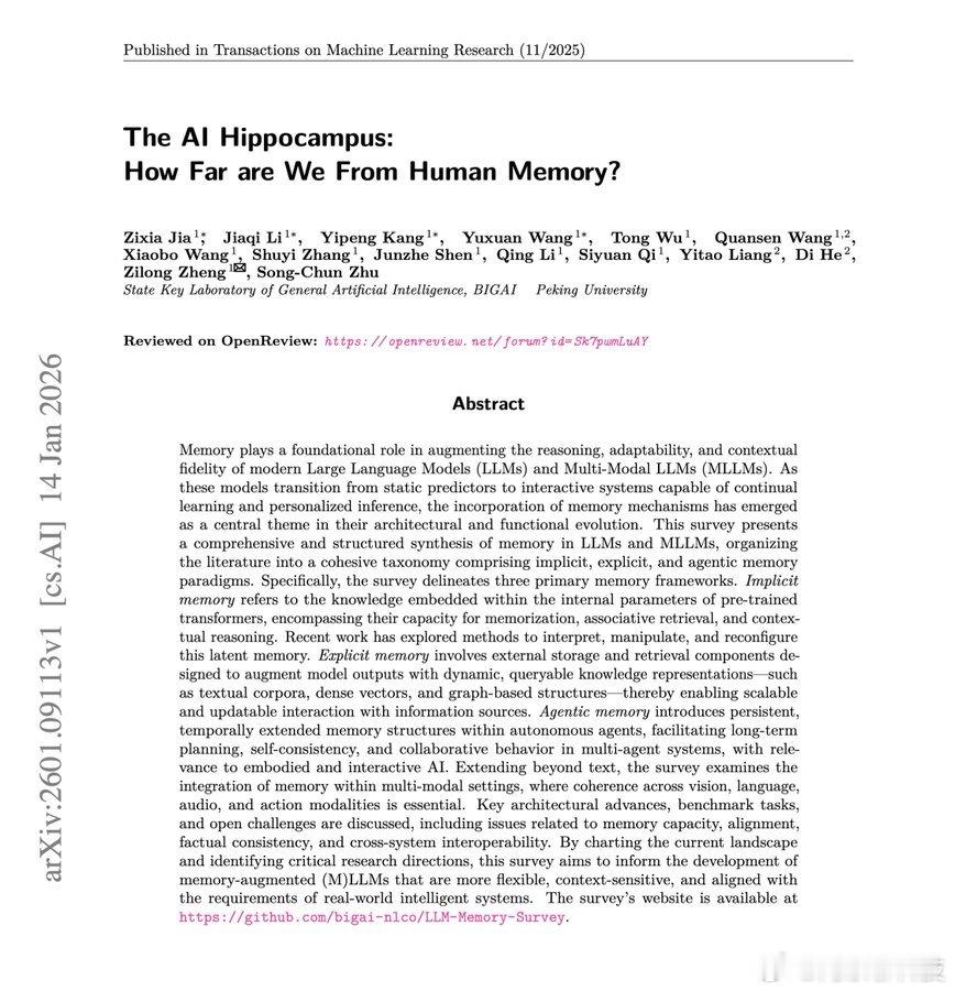 说实话,我认为记忆力是目前持续学习的最大障碍。让我夜不能寐的问题是:我们如何利用记忆避免重蹈覆辙?我们如何教会模型有选择地记忆和遗忘?何时呈现正确的背景信息?人类通过记忆巩固、干扰管理和情境绑定自然而然地做到这一点,然而,我们尚未找到复制这种机制的方法。人类海马系统与当前LLM记忆架构之间的差距揭示了一个根本性的挑战:我们基本上构建了两个极端:要么是将所有信息都硬编码到参数中的模型(刚性模型),要么是使用RAG(随机数生成器)机械地检索信息(模糊模型)。真正的持续学习要求我们破解智能检索的密码;不仅要知道存储什么,还要知道抑制什么、何时强化,以及如何让旧知识优雅地消退而不造成灾难性的干扰。非常喜欢这篇调查,因为它从宏观角度展现了 LLM 和多模态模型中的记忆架构(也很喜欢其中受大脑启发的分类法,很棒!)。我会尽我所能系统地绘制出它的图谱。三部分框架:他们围绕新皮层-海马体-前额叶皮层的类比来构建记忆:内隐记忆/新皮层涵盖了嵌入模型权重中的参数知识,包括记忆编辑技术(如 ROME 和 MEMIT,它们通过精确修改权重来更新事实)、通过 LoRA 等适配器注入知识,以及通过记忆遗忘来删除有害内容。显性记忆/海马体研究外部检索系统;RAG架构、向量数据库、知识图谱。它们详细阐述了如何在不同的粒度(文档、组块、句子、图结构)和优化时间(无训练、联合预训练、SFT等)下组织记忆。智能体记忆/前额皮层探索自主智能体如何维持短期记忆(CoT++)与长期记忆(外部事实数据库、历史轨迹、用户反馈等)。我非常喜欢这个关于记忆的思考框架,但我认为除了分类之外,这项调查最大的贡献在于指出了尚未解决的问题:记忆污染/幻觉、大规模检索的计算负担、何时应该检索信息而不是依赖参数化知识,以及长时间交互过程中记忆一致性的挑战科技先锋官ai生活指南ai创造营