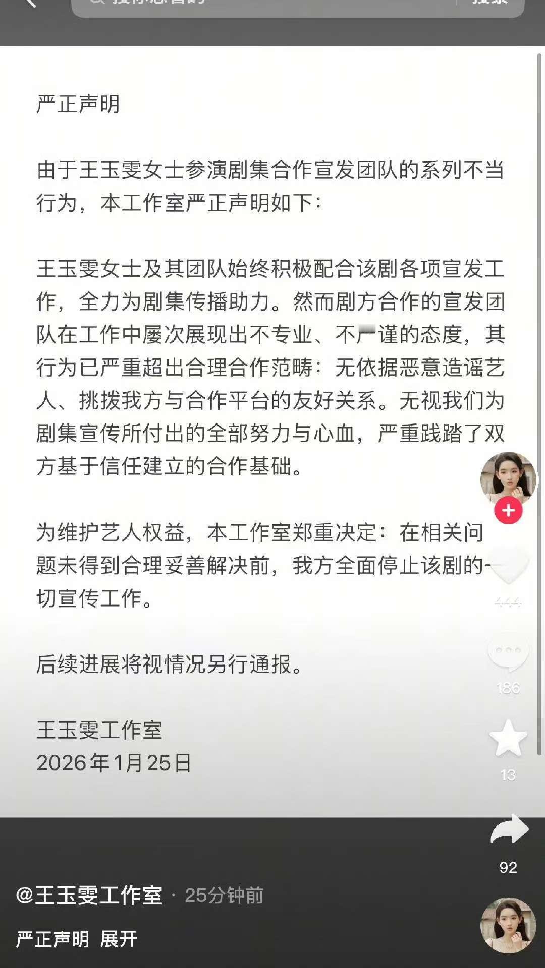 王玉雯方严正声明王玉雯方宣布停止一切剧宣工作1月25日,就参演剧集合作宣发团队