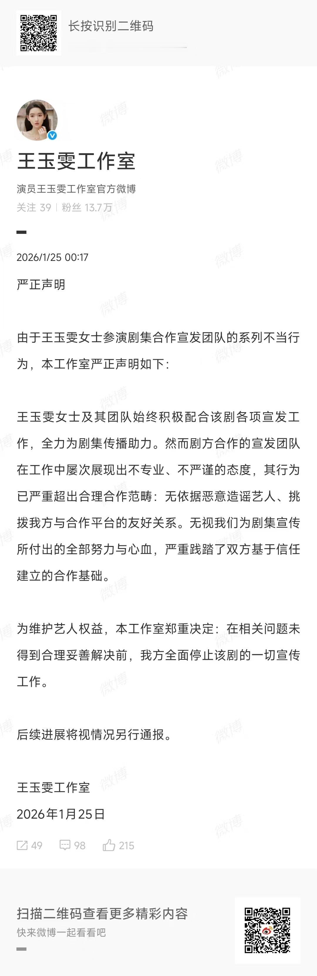 王玉雯工作室将停止一切剧宣工作王玉雯工作室将停止一切宣传工作 发生了什么??