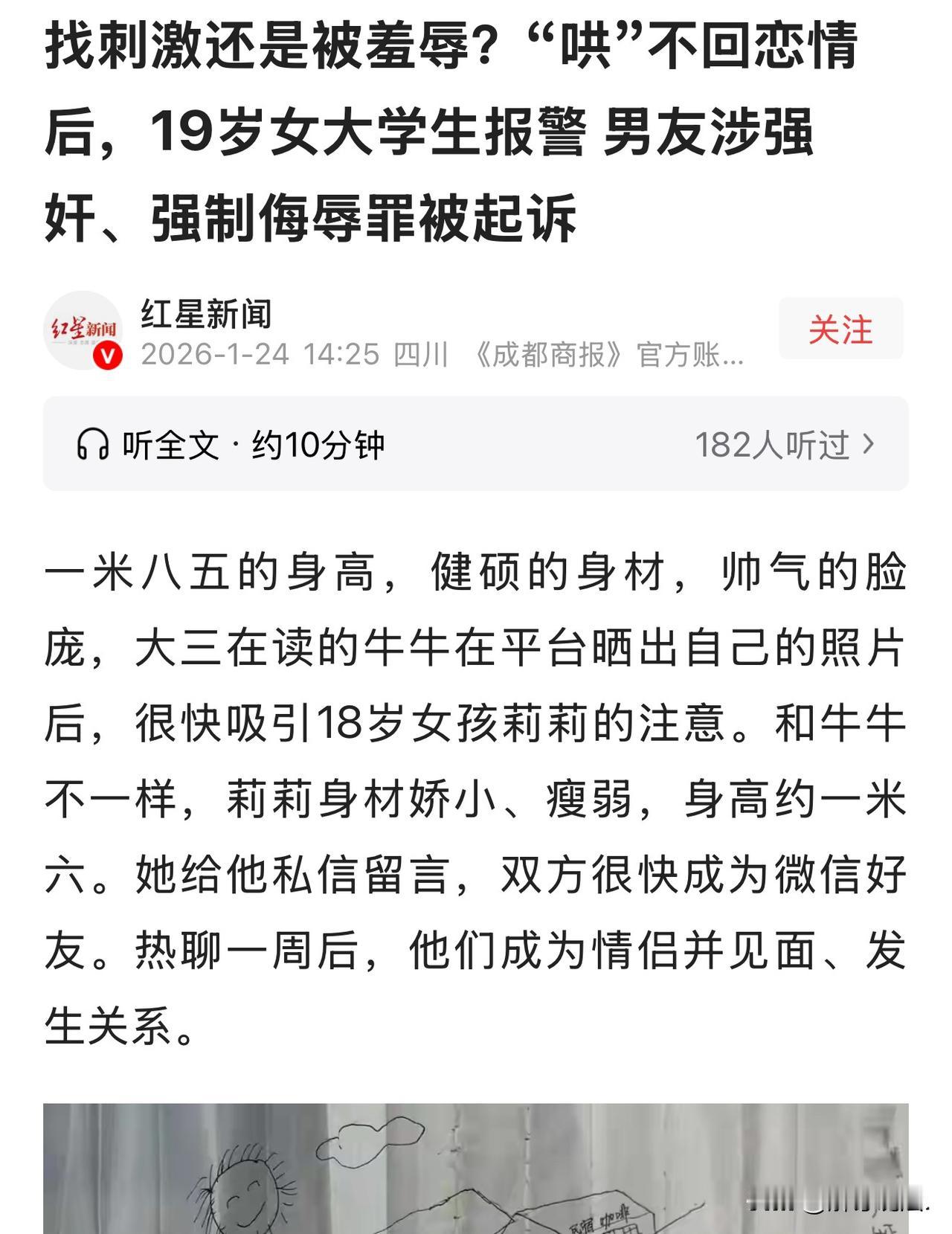 “惊掉下巴!”广西南宁,一男大学生发现女友与其他男生网聊,醋意大发,提出与女友分手。女友不愿意分手,接受男友的“特别玩法!”最终,男友还是劈了。女子气愤之下,报警声称被男方侮辱、强奸。男大学生大喊冤枉,都是她自愿的! 2024年8月,19岁大一女生莉莉刷短视频迷上帅气的大学生牛牛,主动搭讪后两人一周内确定恋爱关系并发生关系,后续相处也算融洽。 2025年3月,牛牛在出租屋看到莉莉和男游戏网友的聊天,醋意大发提分手,莉莉想挽回,牛牛却借机施暴,掌掴、用烟头烫她,还逼她吞痰、吃排泄物,甚至在她手臂文上“牛牛’S”的小狗图案,莉莉心怀愧疚全都照做。 直到3月24日,牛牛告知莉莉自己有了新女友,莉莉才知道感情无法挽回。 次日两人在出租屋发生关系后,莉莉越想越憋屈,认清自己只是牛牛的泄欲工具,果断报警。 警方调查后以涉嫌强奸、强制侮辱罪立案,随后将牛牛移送检方,检方审查后认为其行为违背莉莉意愿,数罪并罚对其提起公诉。 事发后牛牛母亲查看监控,见两人进出有说有笑、莉莉离开时状态良好,认为儿子无罪,又因牛牛还在上学,为减轻影响委托律师给莉莉7万赔偿金,莉莉出具了刑事谅解书。 但该案是公诉案件,谅解仅能从轻处罚,不能免除刑事责任。 目前检方已将案件移交法院,静待开庭审理。 《刑法》第236条规定:强奸罪以暴力、胁迫或其他手段强奸妇女的,处3-10年有期徒刑;有恶劣情节等的,处10年以上有期徒刑、无期徒刑或死刑。 牛牛利用莉莉想挽回感情的心理,以“分手”胁迫,实施掌掴、烟头烫等暴力与侮辱,3月25日的性关系违背莉莉真实意愿,符合“胁迫/其他手段”,构成强奸罪。 《刑法》第237条规定:以暴力、胁迫或其他方法强制侮辱妇女的,处5年以下有期徒刑或拘役;有聚众、当众等恶劣情节的,处5年以上有期徒刑。 牛牛逼莉莉吞痰、吃排泄物、文“牛牛’S”等,以极端手段侮辱其人格,违背意愿,构成强制侮辱罪。检方以两罪数罪并罚起诉,符合法律规定。 《刑事诉讼法》第288条:公诉案件中,被害人谅解不免除刑事责任,仅可从轻处罚。 牛牛母亲给7万获谅解,属酌定从宽情节,但不能改变“数罪并罚”的定罪走向;监控里的“有说有笑”不代表行为合法,核心是“是否违背意愿”,不影响定性。 这事儿看着气人,本质就是渣男借感情施暴,法律可不会惯着! 莉莉年纪小,一时被颜值冲昏头,恋爱脑上头想挽回,却遭了这么大罪,掌掴、烟头烫还被逼做屈辱事,想想都让人发寒。 牛牛看着帅气,心却黑透了,拿别人的真心当肆意妄为的资本,把恋爱当成控制和侮辱他人的借口,简直没人性。 牛牛妈拿监控“有说有笑”当无罪证据,纯属自欺欺人。 表面和谐哪能掩盖暴力和违背意愿的本质?给7万换谅解书,无非是怕影响儿子前途,根本不是真心认错。 还好莉莉最后醒悟报警,没让渣男逍遥法外。公诉案件可不是谅解就能算了的,该担的刑责跑不了。 希望法院能依法严惩,给这种变态渣男一个教训,也给年轻人提个醒:恋爱再上头也得守底线,遇到暴力和侮辱,别忍别妥协,赶紧报警维权,颜值和感情从来都不是伤害他人的挡箭牌!